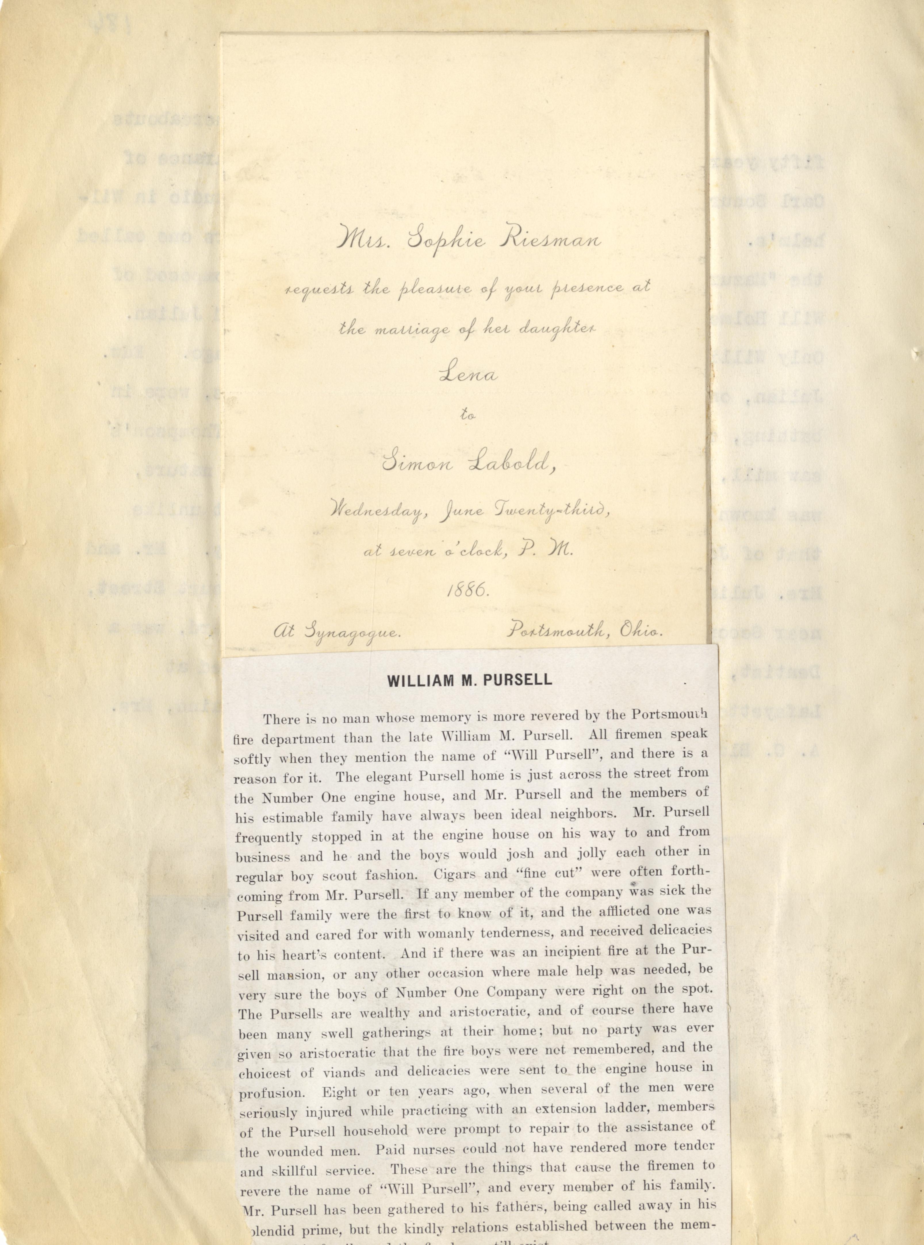 - Photo image of scanned scrapbook page. Pictured is a wedding invitation for Lena Riesman and Simon Labold on June 23, 1886 at the synagogue in Portsmouth. Below: typed page of a remembrance of William Pursell, a well known fireman in Portsmouth for the Number One Fire Company.