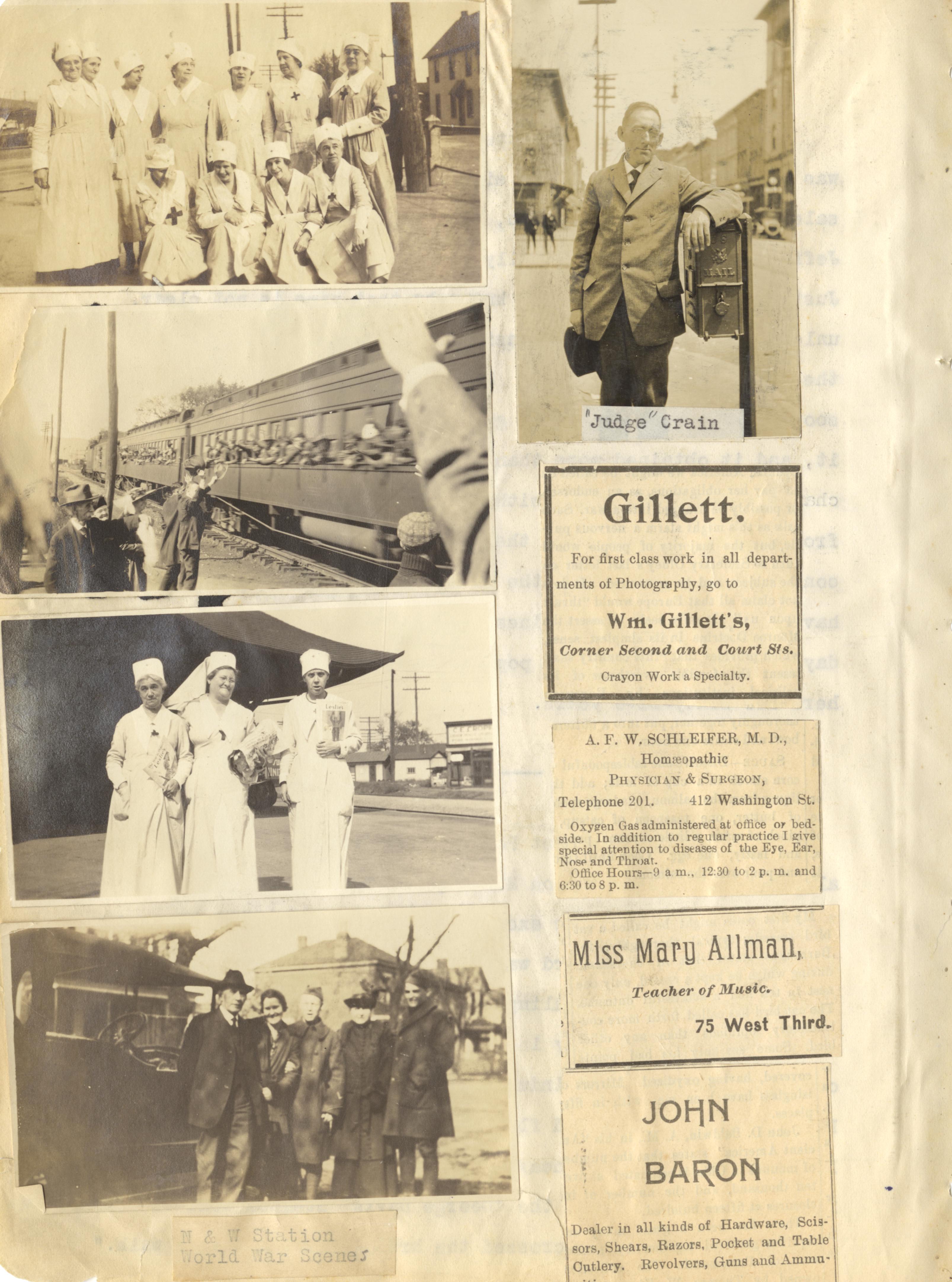 - Photo image of scanned scrapbook page. Pictured are N & W Station, World War Scenes in black and white: Red Cross Nurses; Train Passing By. Also, black and white photo of "Judge" Crain. Newspaper Advertisements: William Gillett's on the corner of Second (2nd) and Court Streets; A. F. W. Schleifer, Physician and Surgeon at 412 Washington Street; Mary Allman, teacher of music at 75 West Third (3rd) Street; John Baron Hardware Dealer