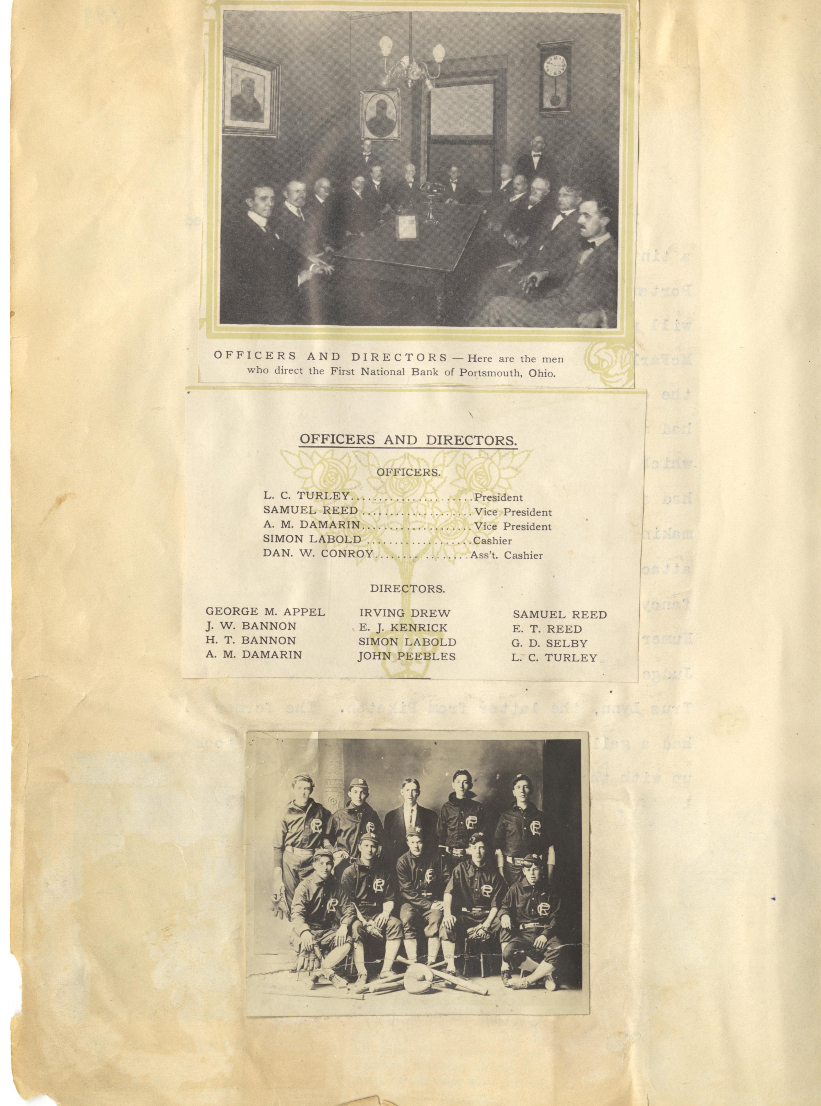 - Photo image of scanned scrapbook page. Pictured is a black and white photo of the Officers and Directors for the First National Bank with a listing below; also, a black and white photo of an unknown baseball team (bottom).