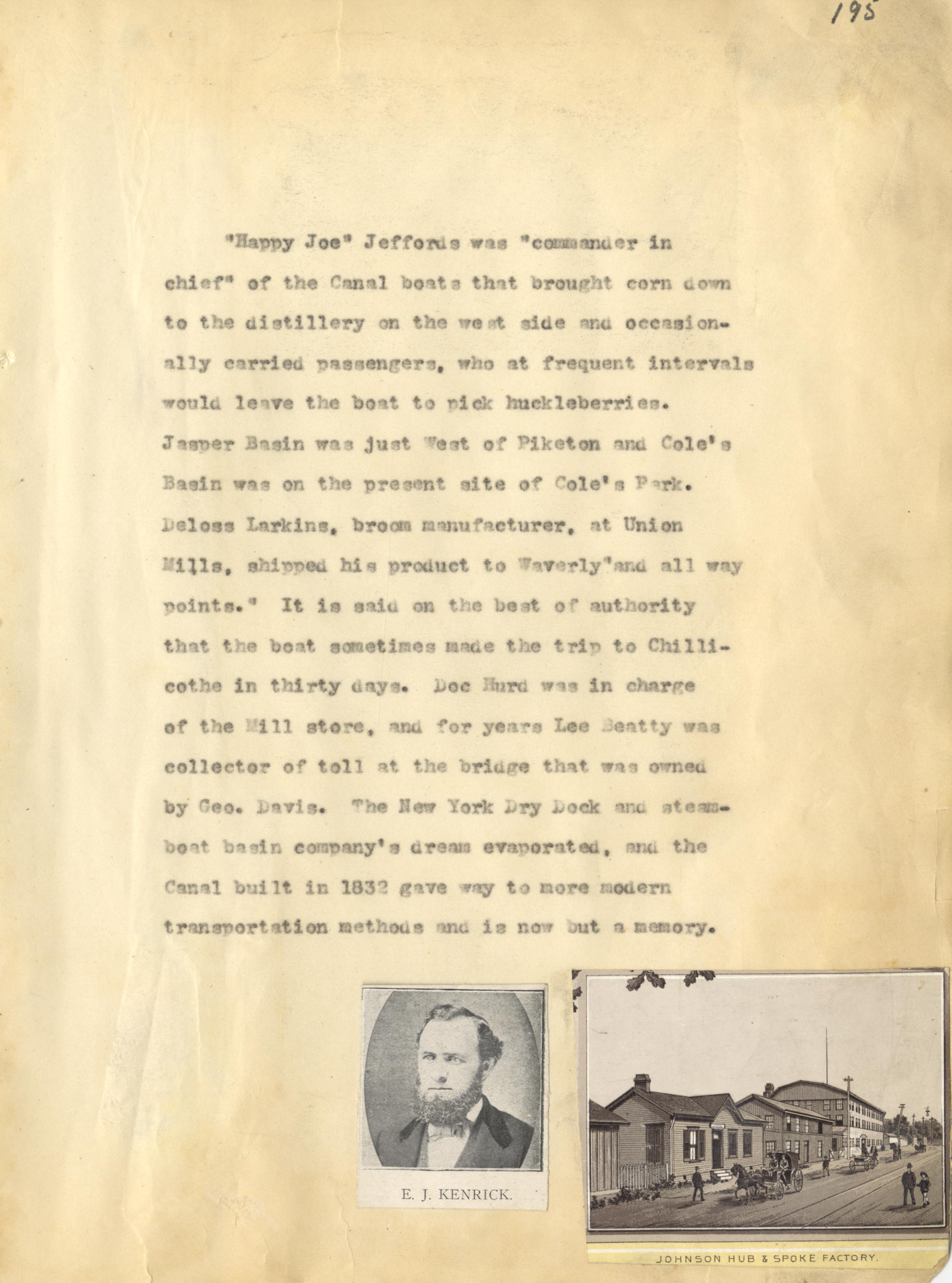 - Photo image of scanned scrapbook page 195. Shown is a typed page detailing events in the life of "Happy Joe" Jeffords, "Commander in Chief" of the Canal boats that brought corn to the distillery on the west side. Cole's Park; Deloss Larkins; Union Mills; Doc Hurd; New York Dry Dock and Steamboat Company; canal.