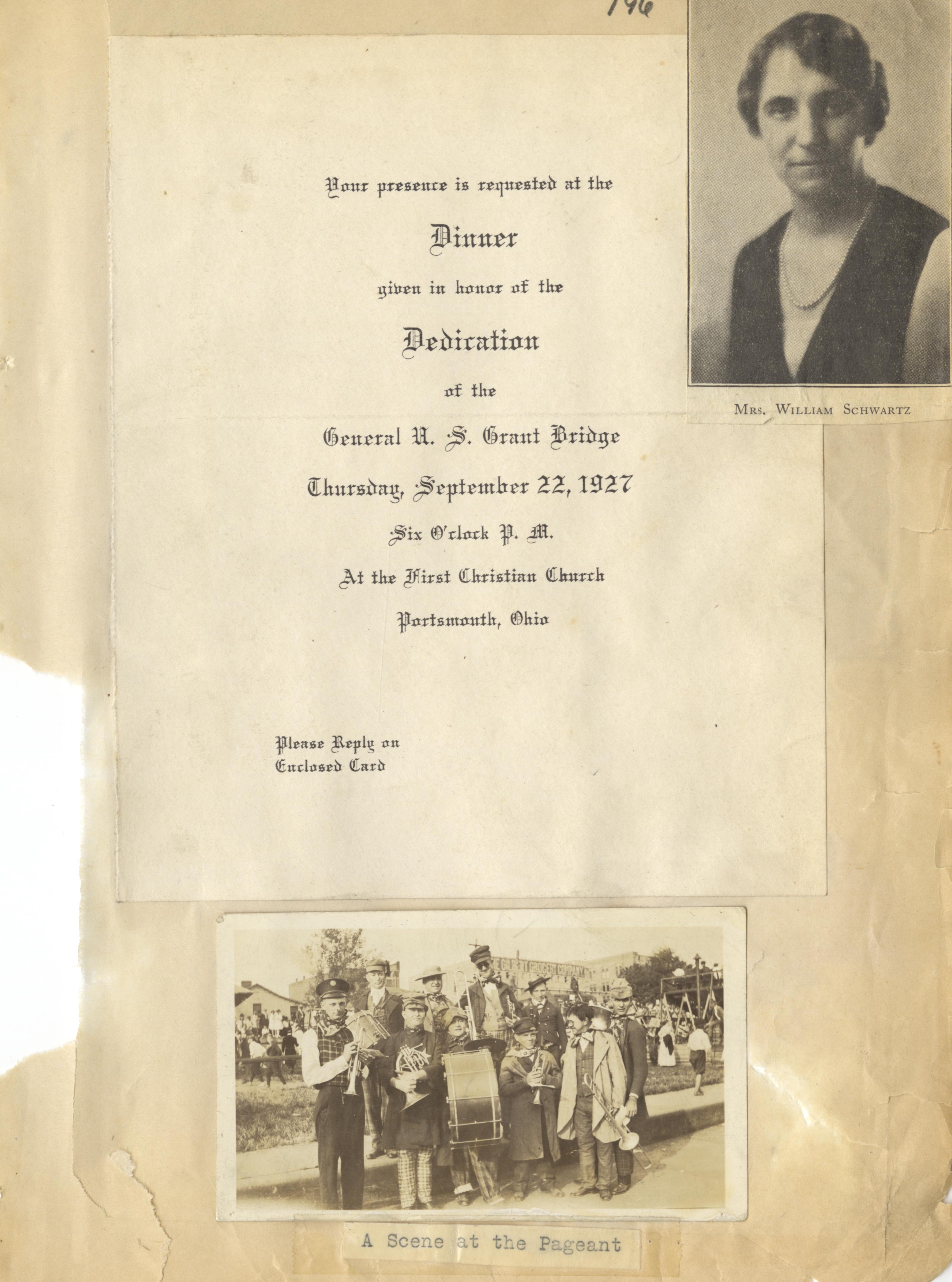 Henry A. Lorberg , “Dedication Dinner For the U. S. Grant Bridge September 22, 1927; Mrs. William Schwartz; A Scene at the Pageant,” Scioto County Public Library Local History Digital Collection, accessed December 5, 2025, https://www.sciotolibrary.org/history/items/show/21477.