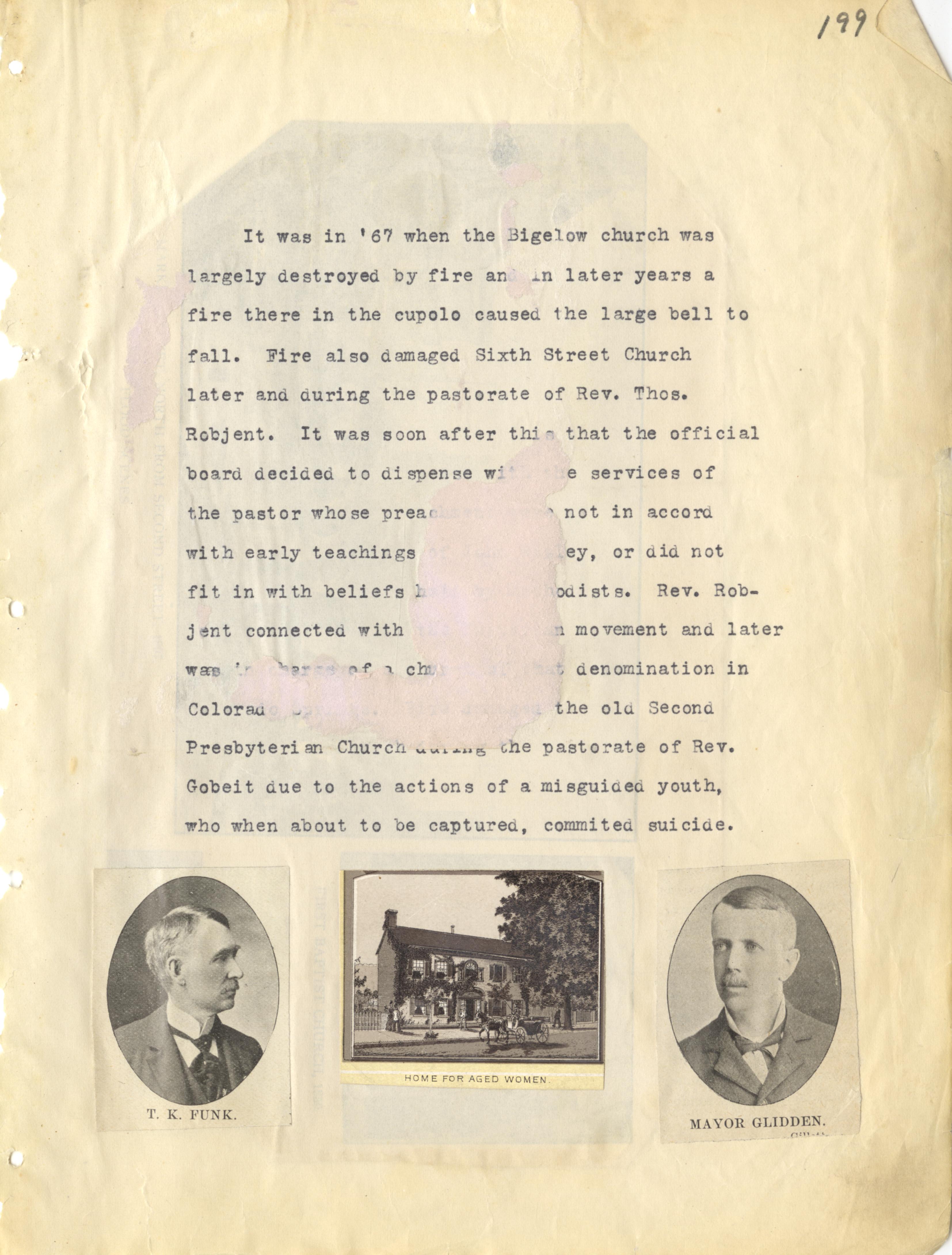 - Bigelow Church Damaged By Fire in 1867; T. K. Funk; Mayor Glidden; Home For Aged Women