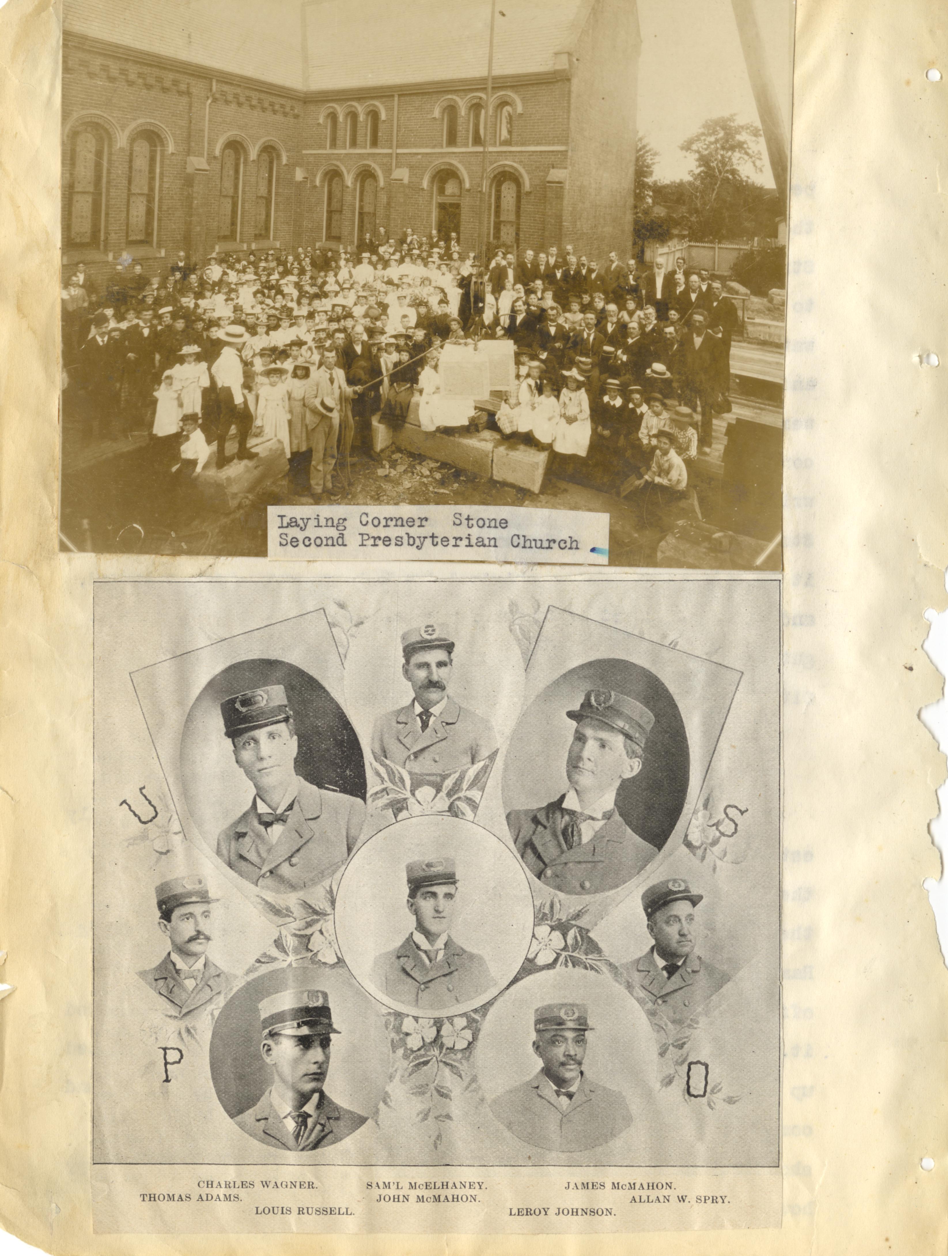 - Photo image of scanned scrapbook page. Pictured is an image of when the corner stone for the Second Presbyterian Church was laid. The church was located at the corner of Waller and Eighth (8th) Streets. Bottom image: men of the U. S. Post Office with names listed below. Charles Wagner, Thomas Adams, Louis Russell, Samuel McElhaney, John McMahon, James McMahon, Leroy Johnson, and Allan W. Spry.