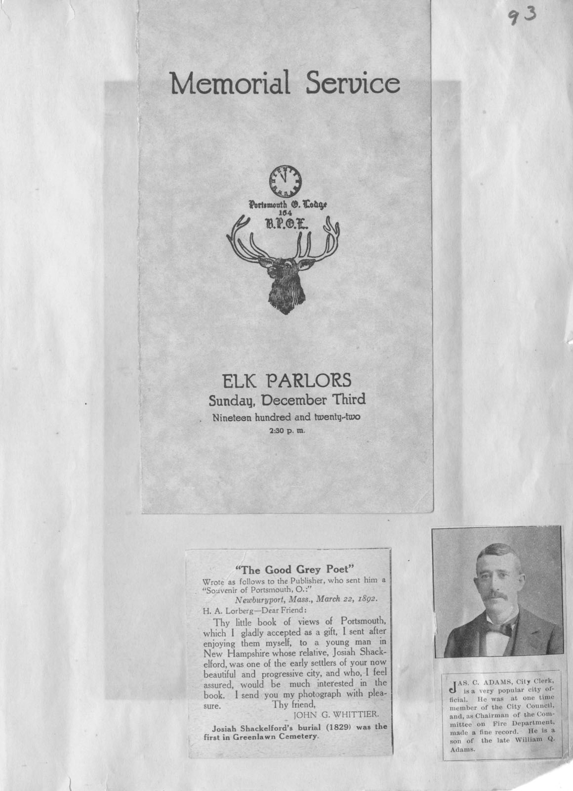 - Scanned page 93 from Henry A. Lorberg scrapbook containing a printed Memorial service announcement at the Elk Parlors; a printed letter to H.A. Lorberg from John G. Whittier regarding receipt of a book of views of Portsmouth; and a black & white image of Jason C. Adams, City Clerk.