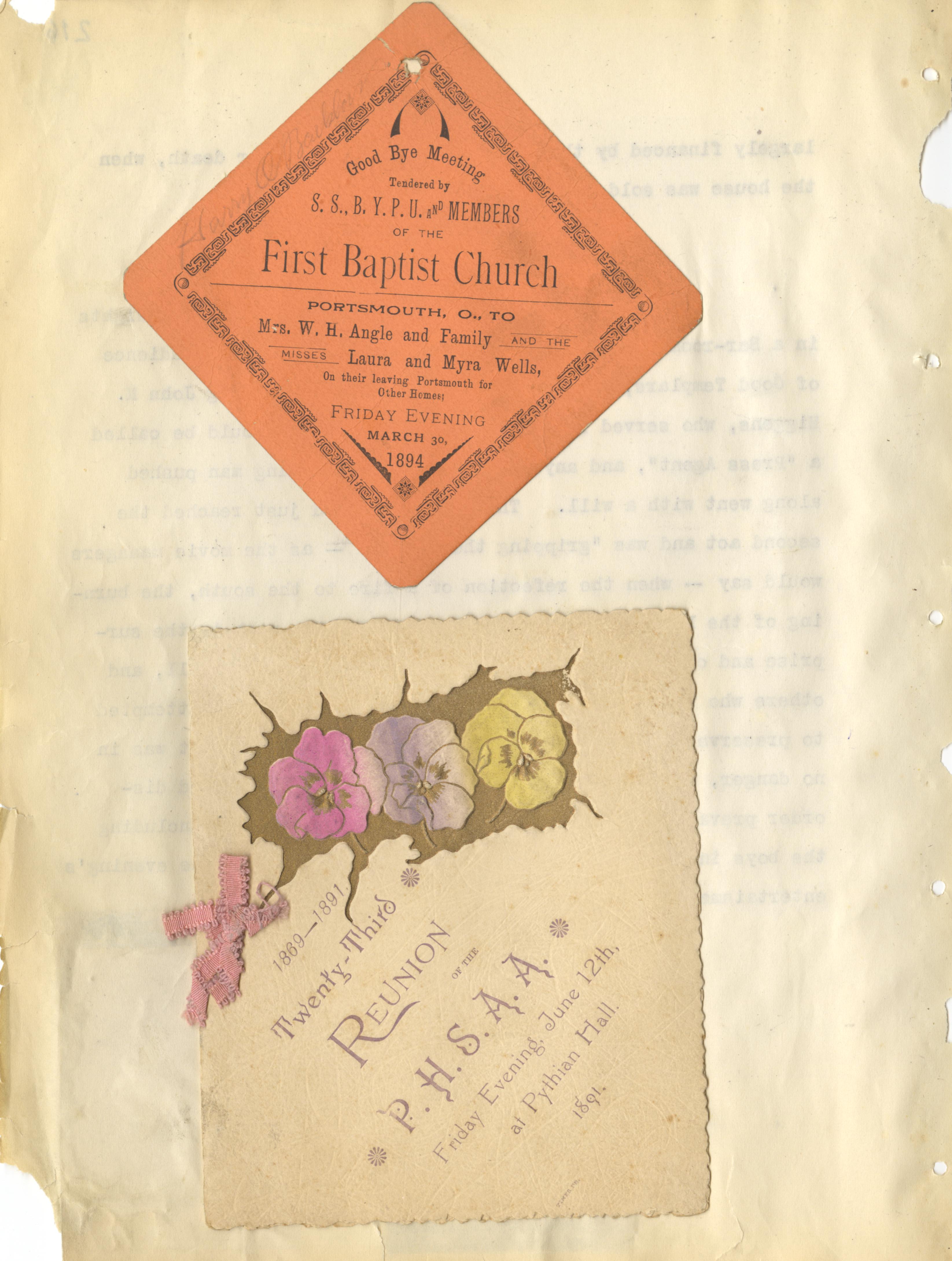 Henry A. Lorberg , “Goodbye Meeting for the Angle Family and Laura and Myra Wells at the First Baptist Church on March 30, 1884; Twenty- Third Reunion of the P. H. S. A. A. (1869-1891),” Scioto County Public Library Local History Digital Collection, accessed December 5, 2025, https://www.sciotolibrary.org/history/items/show/21520.