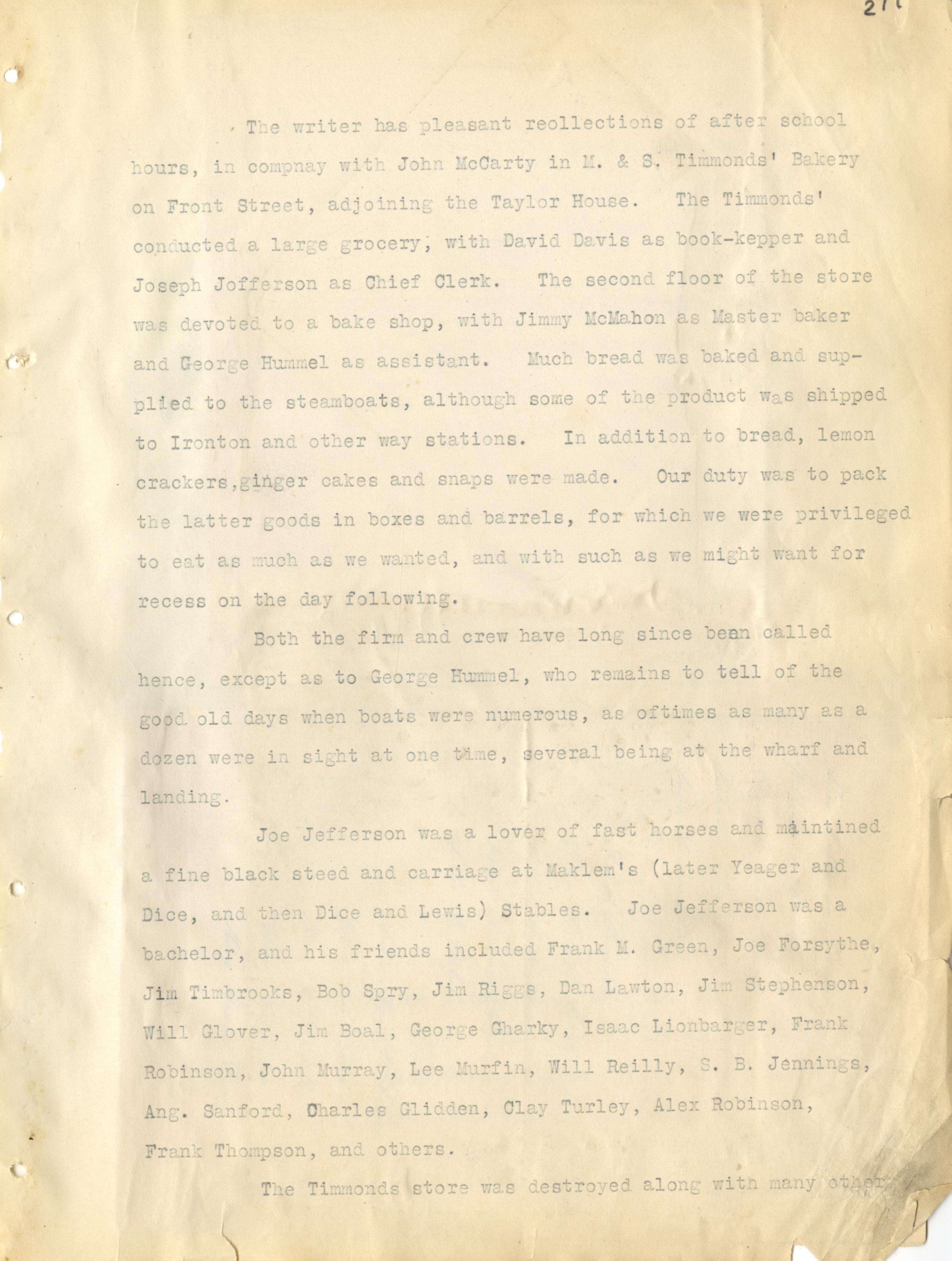 - Photo image of scanned scrapbook page. typed page giving details about some Portsmouth musings: After school hours; M & S Timmond's Bakery; Joe Jefferson's love of horses; Marklem's Stables; John McCarty in M & S Timmonds' Bakery; Taylor House; David Davis; Joseph Jefferson; Jimmy McMahon; George Hummel; Frank M. Green; Joe Forsythe; Jim Timbrooks; Bob Spry; Jim Riggs; Dan Lawton; Jim Stephenson; Will Glover; Jim Boal; George Gharky; Isaac Lionbarger; Frank Robinson; John Murray; Lee Murfin; Will Reilly; S. B. Jenning; Ang Sanford; Charles Glidden; Clay Turley; Alex Robinson; Frank Thompson; Timmonds Store