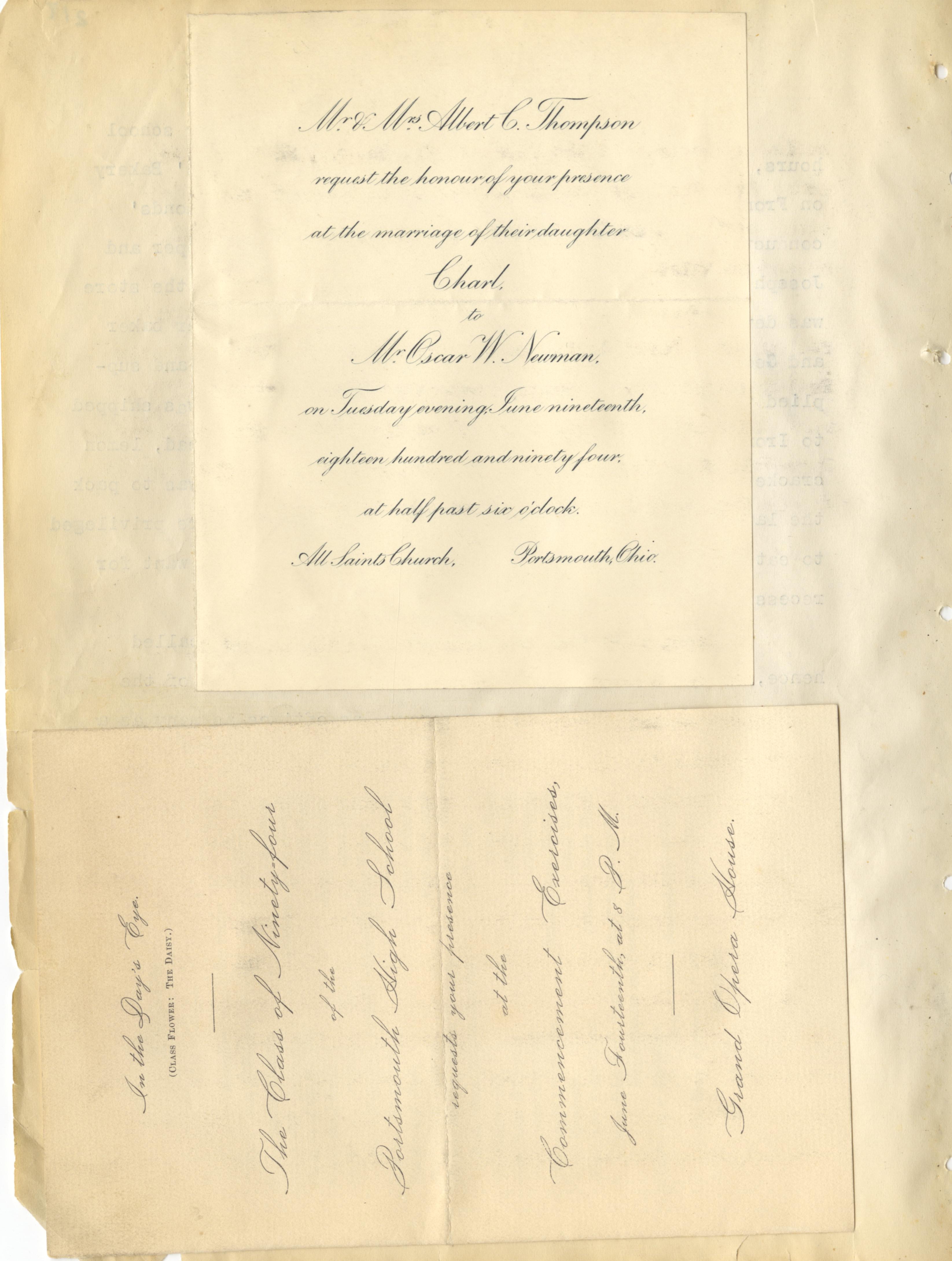 - Photo image of scanned scrapbook page. Pictured: Wedding Invitation for Charl Thompson and Oscar W. Newman on June 19, 1894 at All Saints' Church; Graduation Announcement for the Commencement Exercises for the Class of 1894 at the Grand Opera House