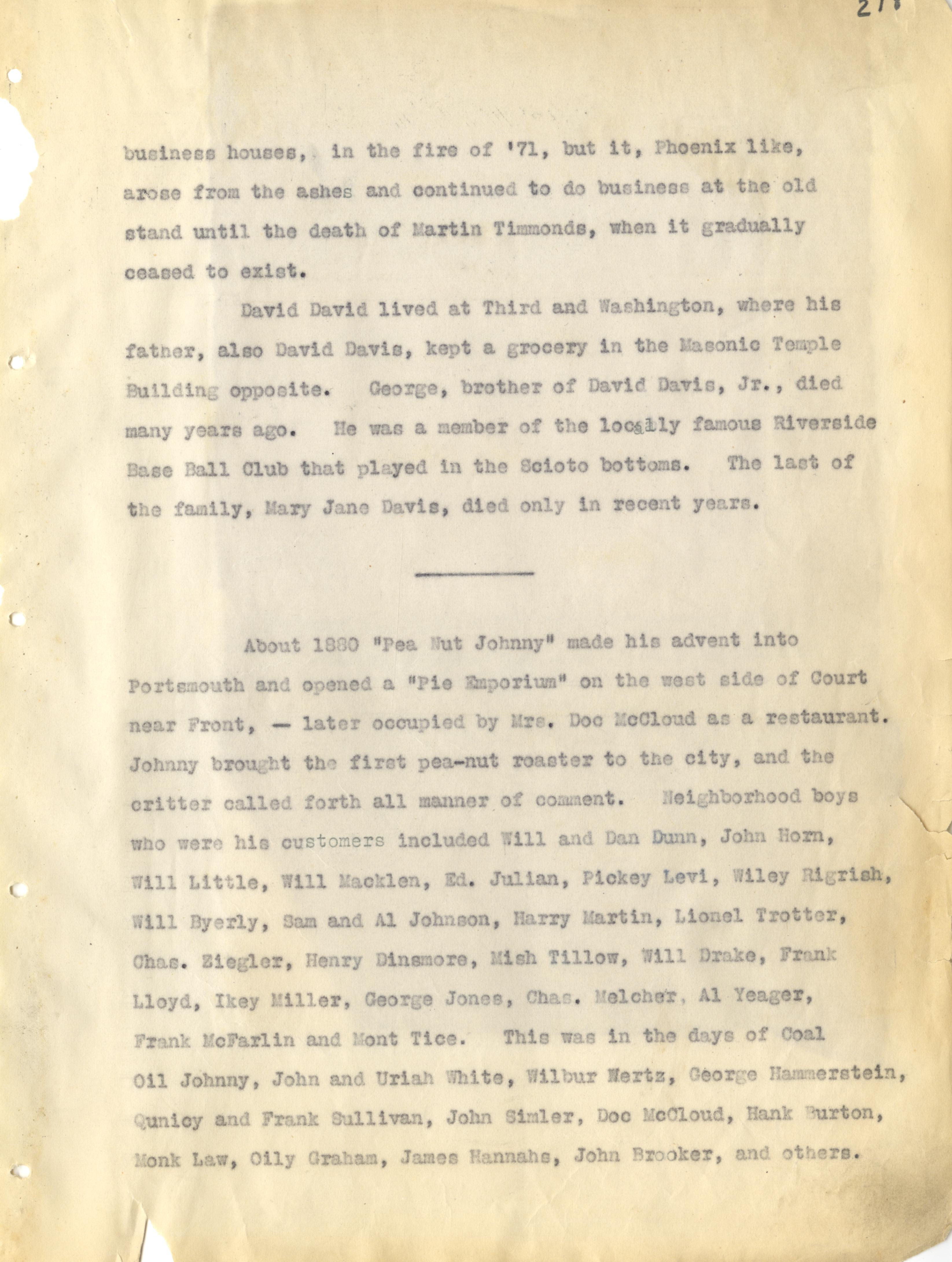 - Photo image of scanned scrapbook page. Typed page giving the ending of the information on the Massie Block Fire of 1871. Bottom story: the beginnings of Pea Nut Johnny's Pie Emporium and his customers. Martin Timmonds; David David; George Davis Jr.; Mrs. Doc. McCloud; Will Dunn; Dan Dunn; John horn; Will Little; Will Macklen; Edward Julian; Pickey Levi; Wiley Rigrish; Will Byerly; Sam Johnson; Al johnson; Charles Melcher; Harry Martin; Lionel Trotter; Charles Ziegler; Henry Dinsmore; Mish Tollow; Will Drake; Frank Lloyd; Ikey Miller; George Jones; Al Yeager; Frank McFarlin; Coal Oil Johnny ; John White; Uriah White; Wilbur Wertz; George Hammerstein; Quincy Sullivan; Frank Sullivan; John Simler; John Simler; Doc McCloud; Hank Burton; Monk Law; Oily Graham; James Hannahs; John Brooker