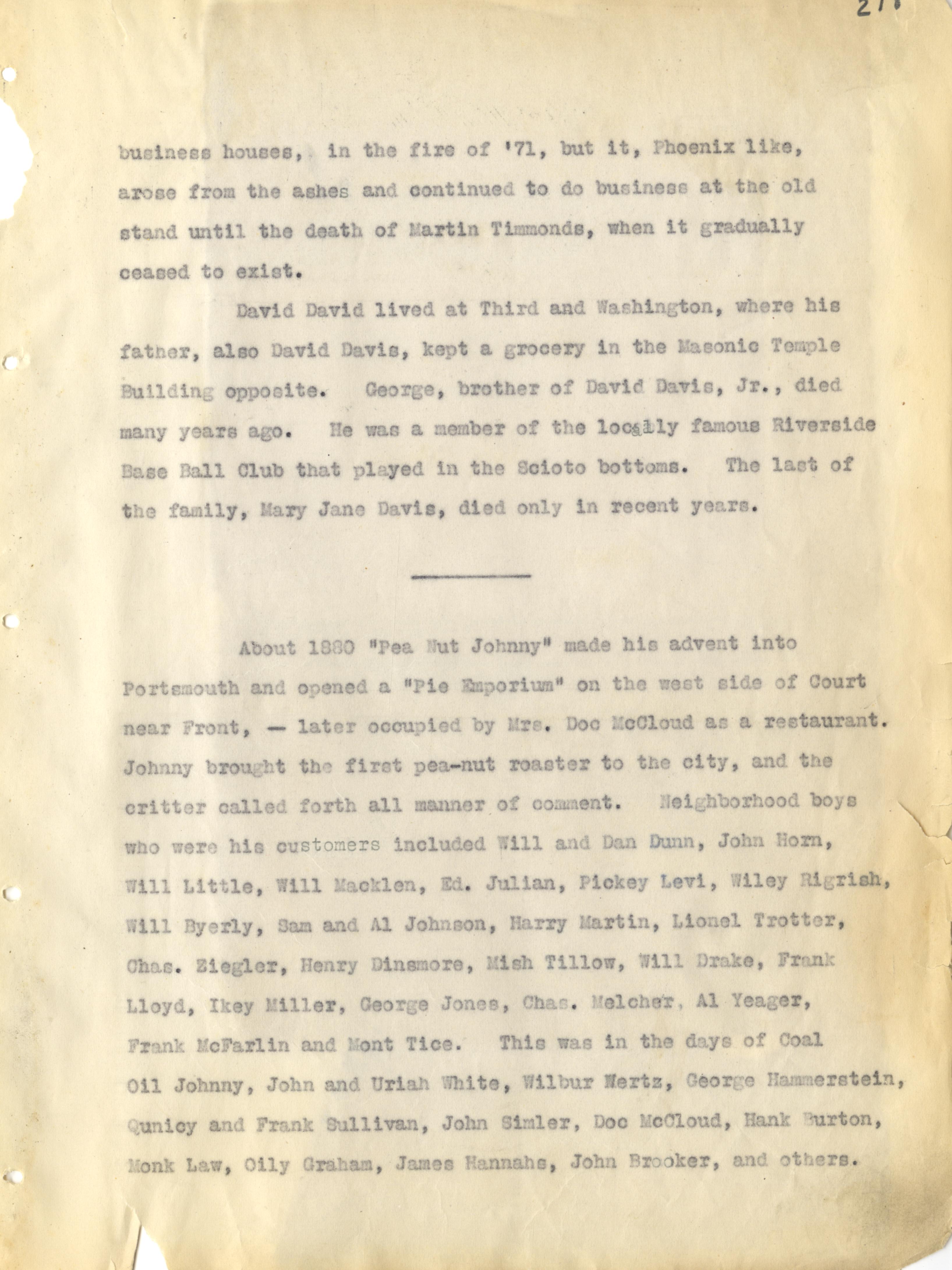 - Photo image of scanned scrapbook page. Typed page giving the ending of the information on the Massie Block Fire of 1871. Bottom story: the beginnings of Pea Nut Johnny's Pie Emporium and his customers. Martin Timmonds; David David; George Davis Jr.; Mrs. Doc. McCloud; Will Dunn; Dan Dunn; John horn; Will Little; Will Macklen; Edward Julian; Pickey Levi; Wiley Rigrish; Will Byerly; Sam Johnson; Al johnson; Charles Melcher; Harry Martin; Lionel Trotter; Charles Ziegler; Henry Dinsmore; Mish Tollow; Will Drake; Frank Lloyd; Ikey Miller; George Jones; Al Yeager; Frank McFarlin; Coal Oil Johnny ; John White; Uriah White; Wilbur Wertz; George Hammerstein; Quincy Sullivan; Frank Sullivan; John Simler; John Simler; Doc McCloud; Hank Burton; Monk Law; Oily Graham; James Hannahs; John Brooker