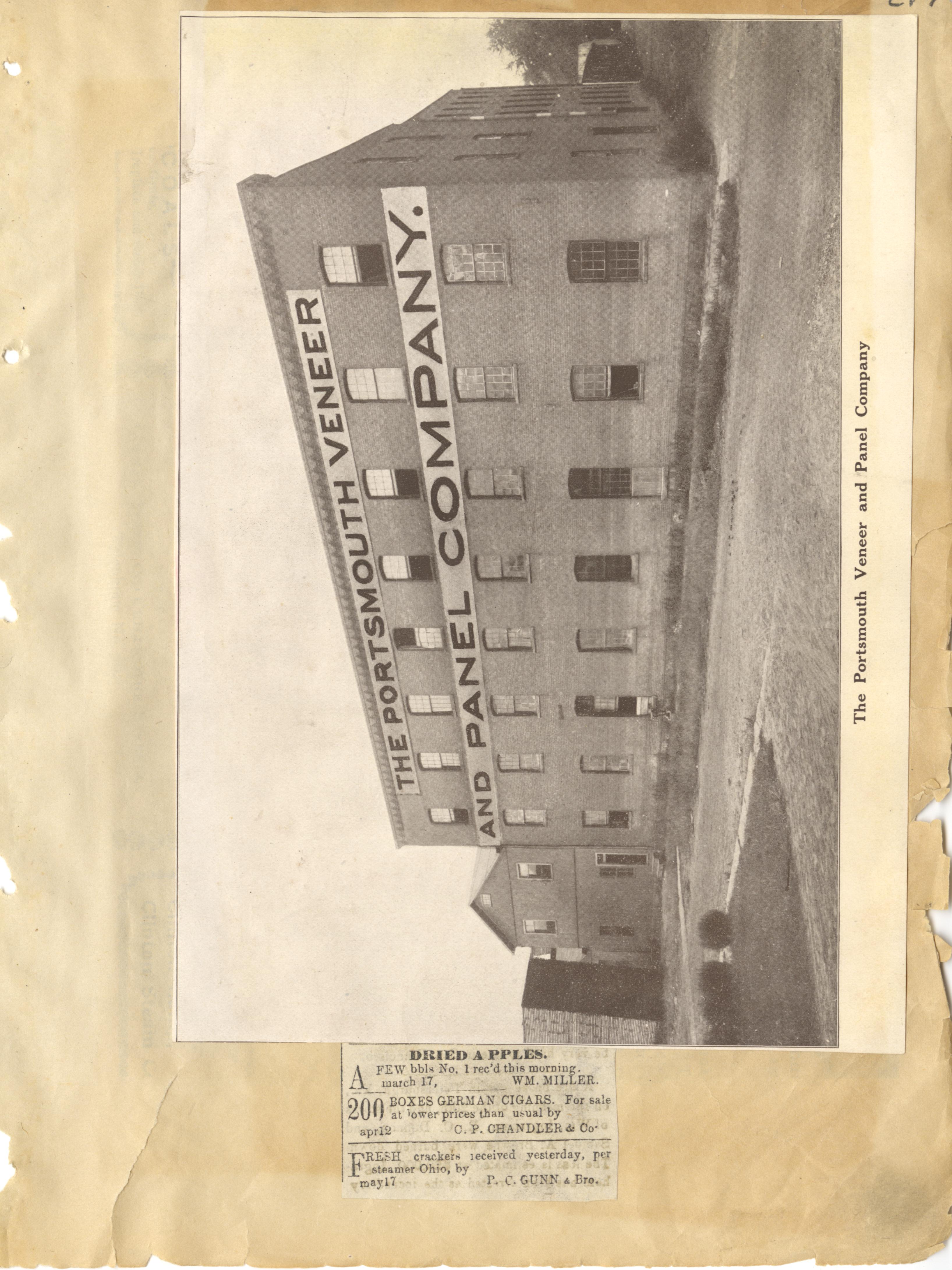 - Photo image of scanned scrapbook page. Pictured is a cut page from Pictorial Portsmouth of the Portsmouth Veneer and Panel Company at the corner of Mill and Gay Streets. It specialized in the manufacturing of glass and panes for windows and veneers.