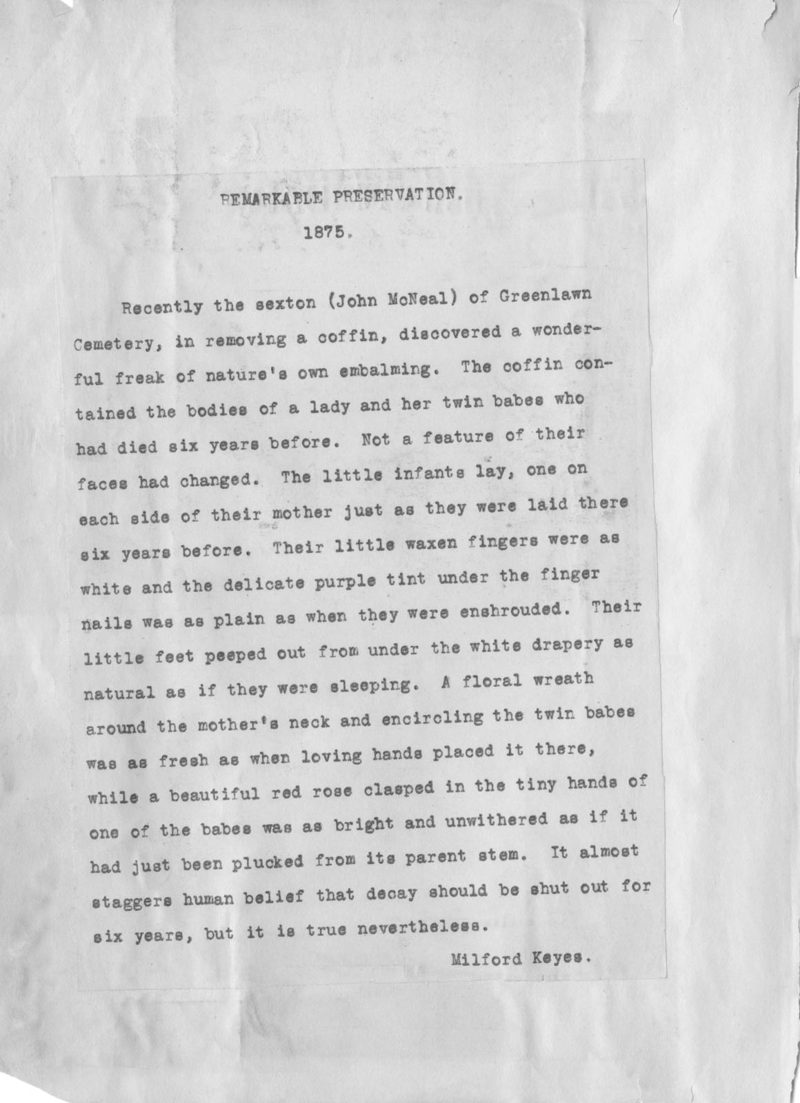 - Scanned unnumbered page from Henry A. Lorberg scrapbook containing typed text about a sexton (John McNeal) of Greenlawn Cemetery who removed the coffin of a woman and her twin babies whose bodies were perfectly preserved after 6 years.