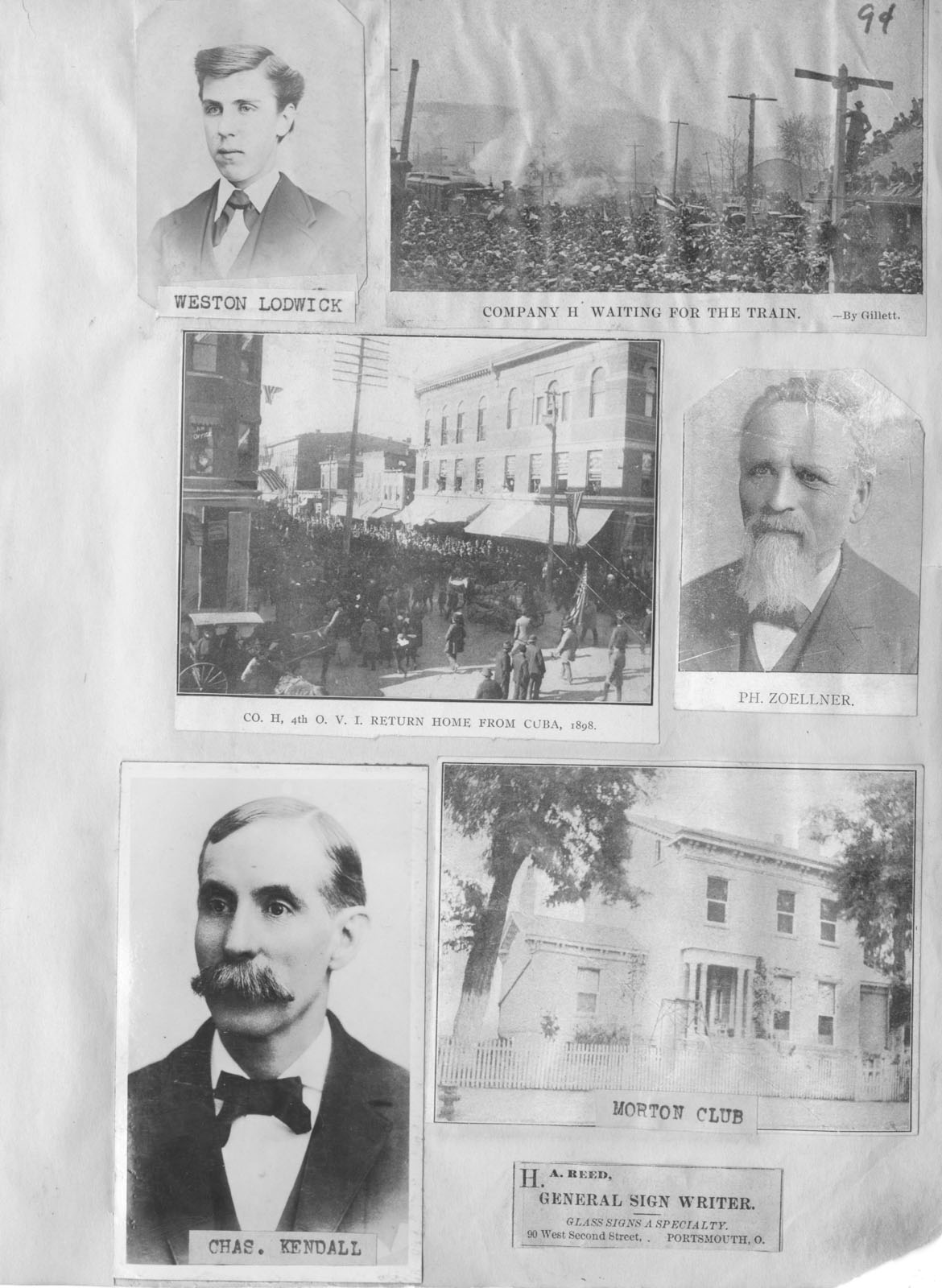 - Scanned page 94 from Henry A. Lorberg scrapbook containing black & white images of Weston Lodwick; Company H, waiting for the train; Company H, 4th O.V.I. return from Cuba, 1898 (Spanish-American War); Ph. Zoellner; Charles Kendall; Morton Club; and an ad clipping for H. A. Reed, General Sign Writer.