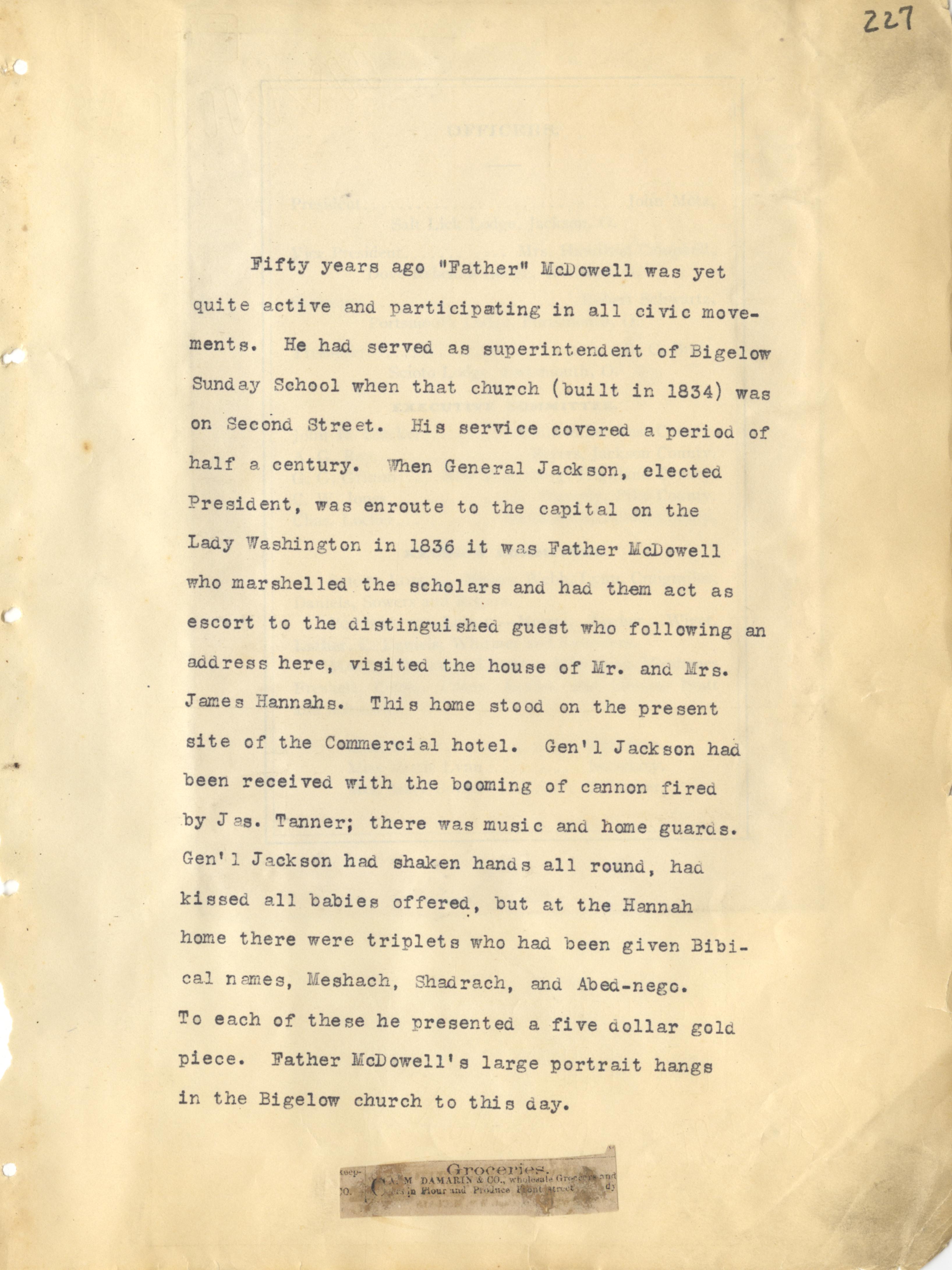 - Photo image of scanned scrapbook page. Pictured is a typed page giving details about "Father" McDowell. He served as superintendent of Bigelow Sunday School when the church was on Second (2nd) Street. General Jackson; Lady Washington; James Hannahs; Mrs. James Hannahs; Commercial Hotel; triplets: Meshach Hannahs, Shadrach Hannahs, Abednego Hannahs