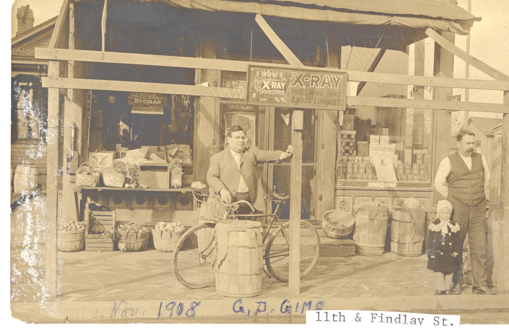 - Black and white photo of two men and a little girl in front of the Gims & Bierly Grocery at 1029 Findlay Street in about 1908. The Portsmouth City Directory of 1908-09 lists the George D. Gims residence at 1027 Findlay.