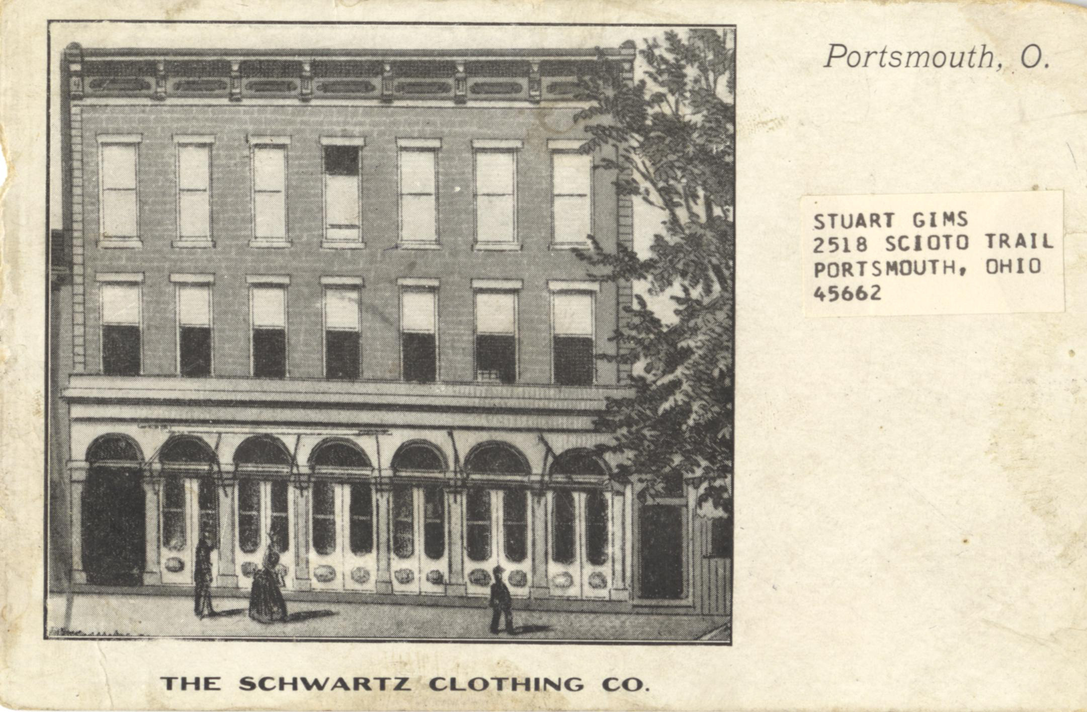 - Black and white drawing of the Schwartz Clothing Company operated by William H. Schwartz from about 1910 until 1932 when the company was closed. The City Directory lists Schwartz Clothing on the southeast corner of Chillicothe and Fourth from 1910 until 1924 and from 1926 until 1932 the address was 1001 Gallia Street. It is unknown which location is represented on this card.