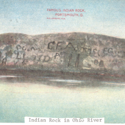 - Colorized photo image of the Indian (Head) Rock in the Ohio River. A note printed on the back: "To be seen only during extreme low water." Prominent citizens scratched names and initials on the rock. One image seems to be a smiling face. Some believed this was an ancient Indian hieroglyph.