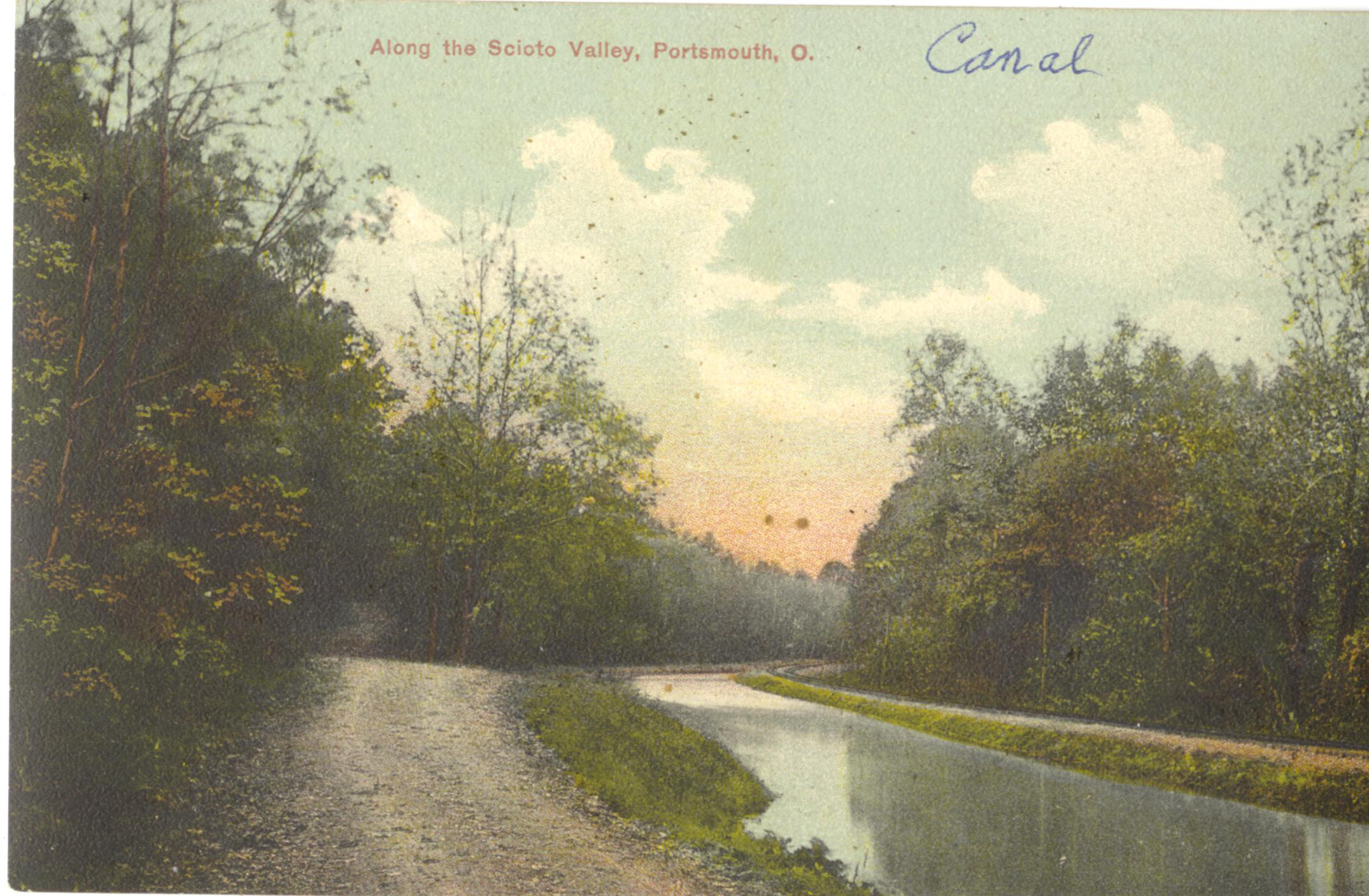 - Colorized photo image of railroad tracks, the towpath, and the canal on the west side of Scioto county
