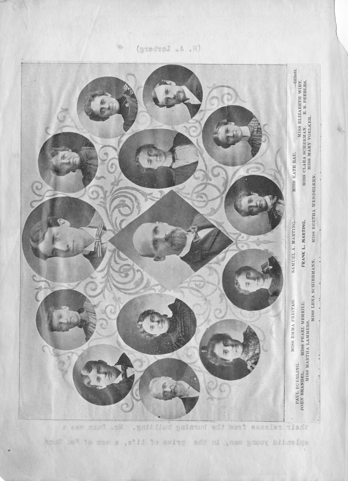 - Scanned unnumbered page from Henry A. Lorberg scrapbook containing a collection of black & white photographs: Miss Emma Freitag, Samuel A. Marting, Miss Kate Rau, Paul Buerling, Miss Elizabeth Wirt, John Brandell, Miss Pearl Merrill, Frank L. Marting, Miss Clara Scherman, E.R. Peebles, Miss Martha Lammers, Miss Mary Voelker, Miss Lena Schirrmann, Miss Bertha Wendelken.