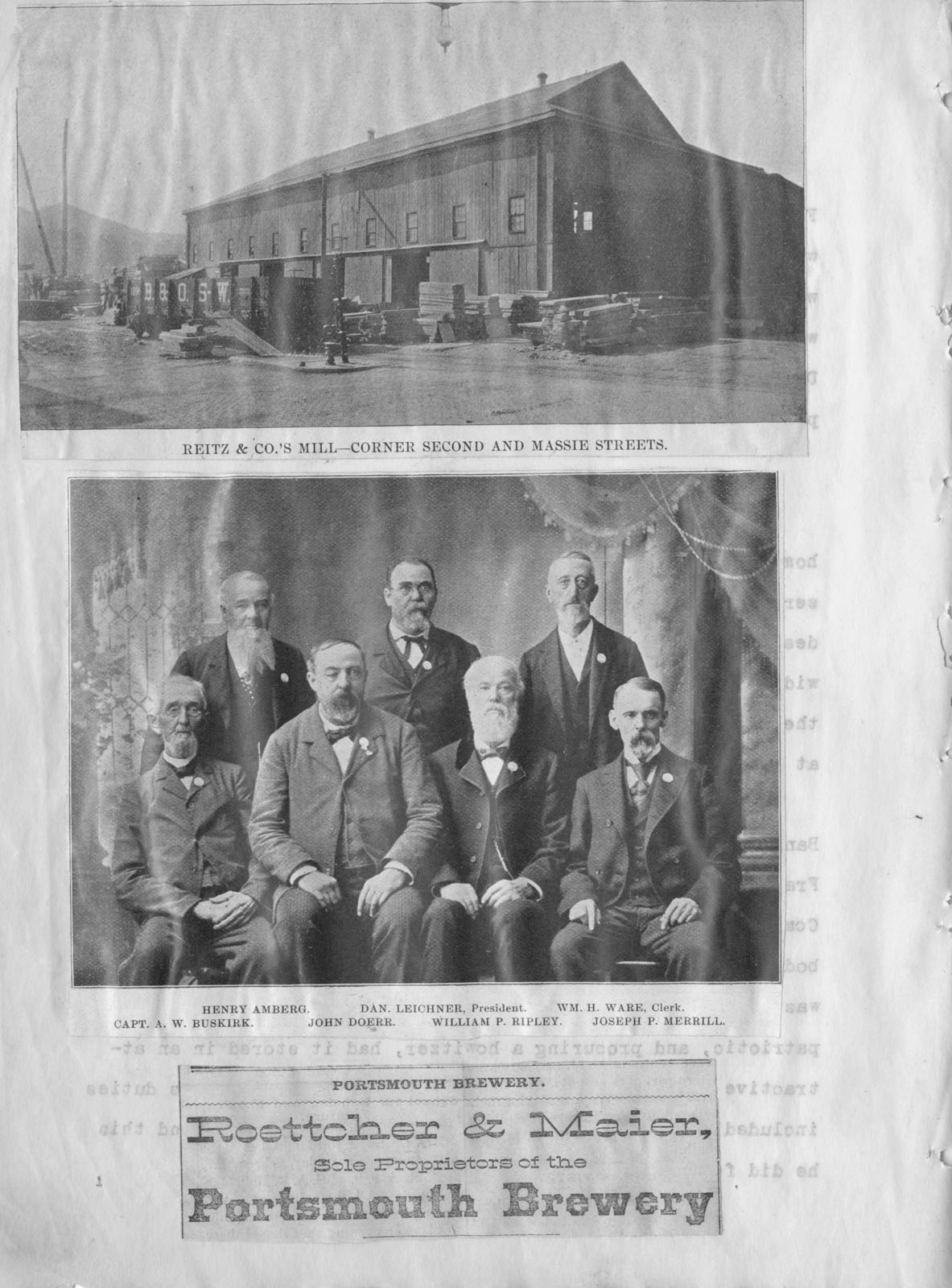 - Scanned unnumbered page from Henry A. Lorberg scrapbook containing black & white images of Reitz & Co.'s Mill at the corner of Second (2nd) and Massie Streets; a group photo of seven men: Henry Amberg, Dan Leichner, Captain A.W. Buskirk, John Doerr, William P. Ripley, William H. Ware, Joseph P. Merrill; and a clipping of an ad for Roettcher & Maier, sole proprietors of the Portsmouth Brewery