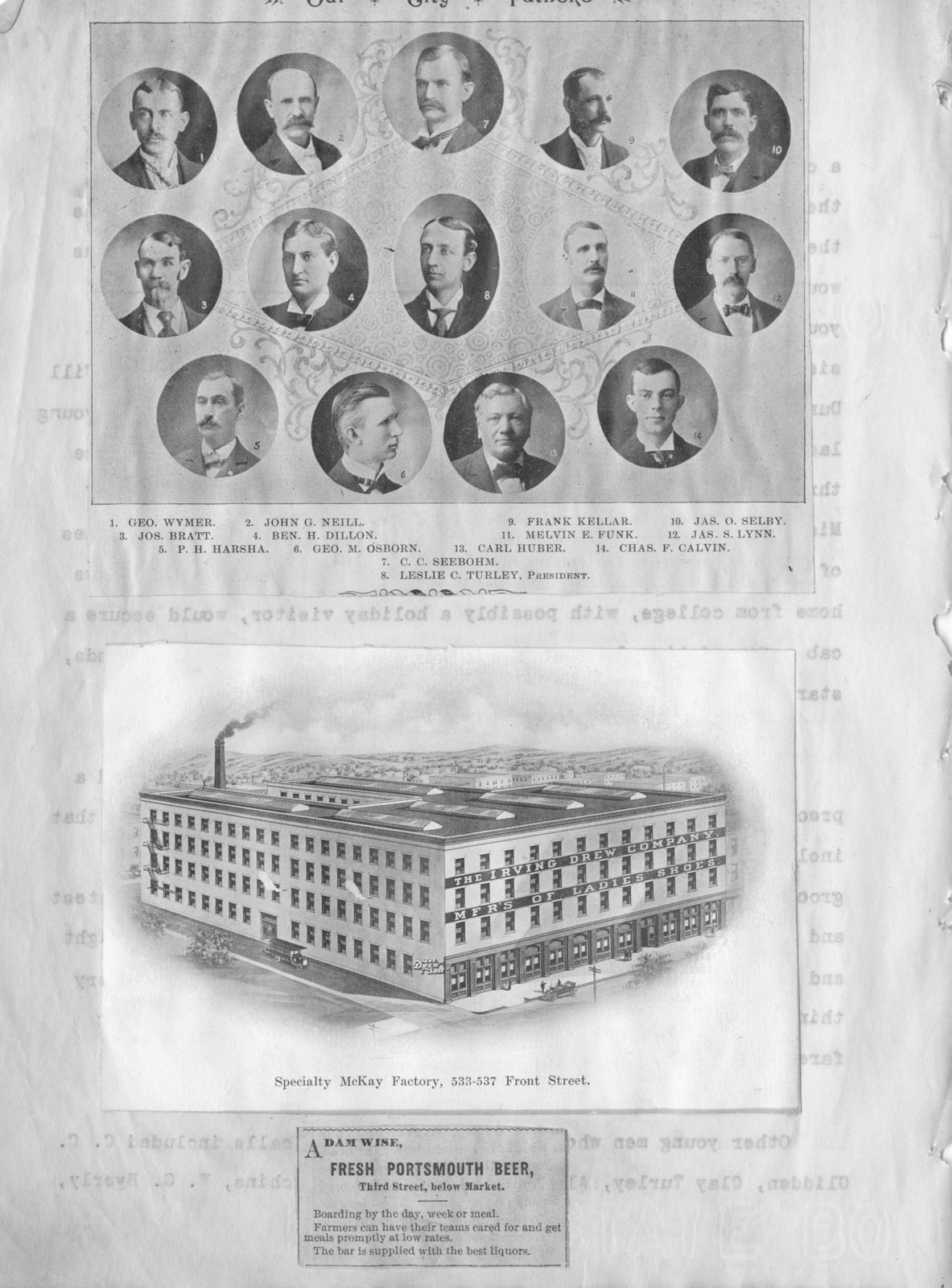 - Scanned unnumbered page from Henry A. Lorberg scrapbook containing black & white set of images of the City Fathers: George Wymer; John G. Neill; Joseph Bratt; Ben. H. Dillon; P. H. Harsha; George M. Osborn; C. C. Seebohm; Leslie C. Turley, President; Rank Kellar; Jas. O. Selby; Melvin E. Funk; Jas. S. Lynn; Carl Huber; Charles F. Calvin. Black & white image of Irving Drew Company, "Specialty McKay Factory, 533-537 Front Street"; and a clipping of a newspaper ad for Adam Wise, Fresh Portsmouth Beer.