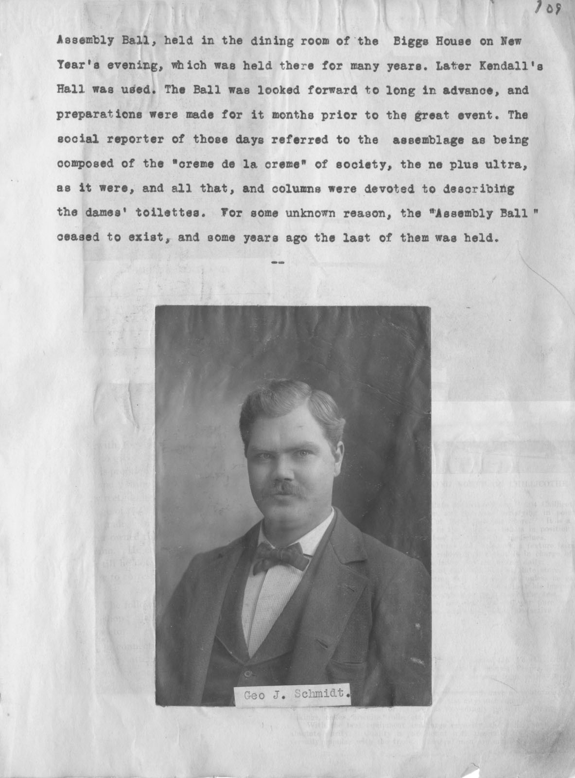 - Scanned page 109 from Henry A. Lorberg scrapbook containing printed text recounting the early observances of New Year's Day at the Assembly Ball held at the Biggs House and later Kendall's Hall.