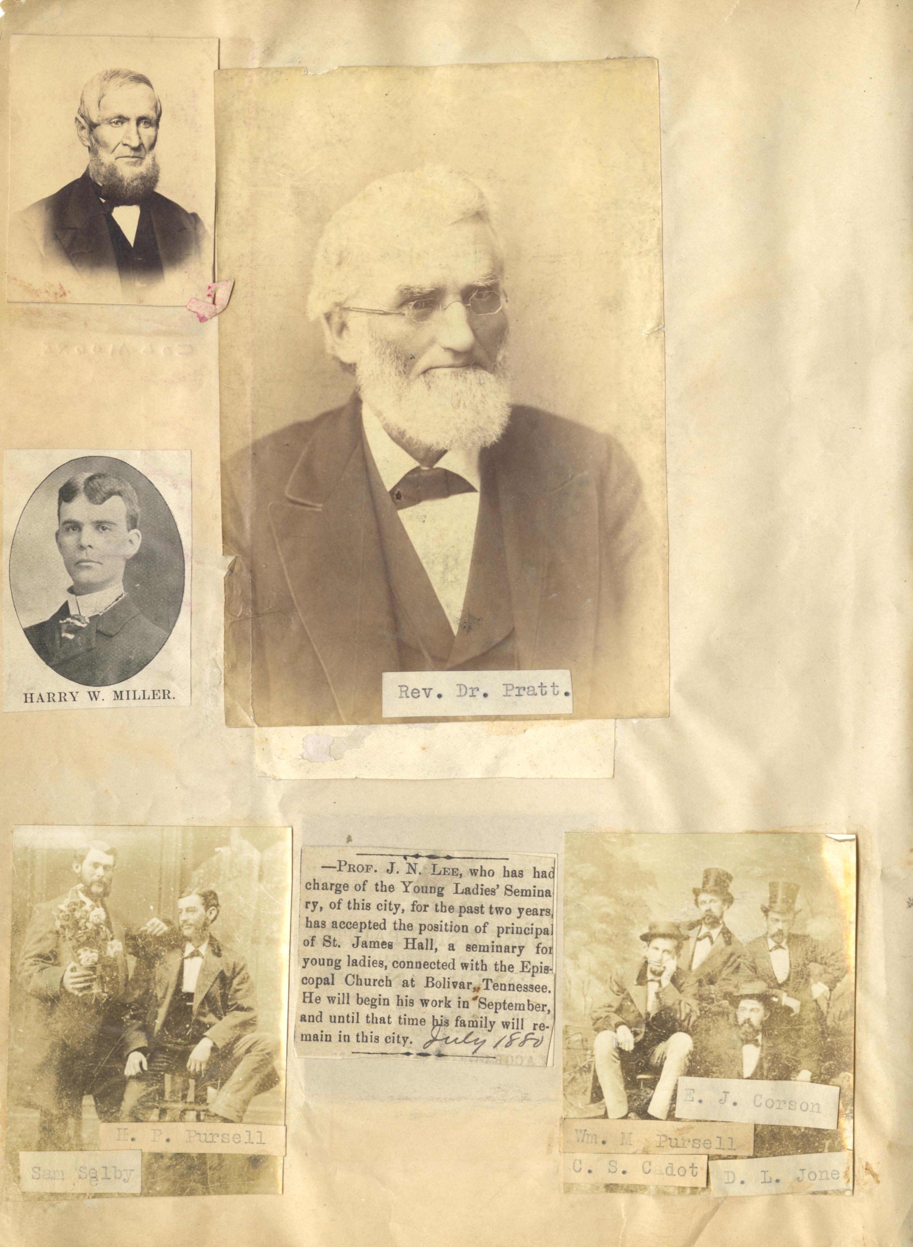 - Scanned unnumbered page from Henry A. Lorberg scrapbook containing sepia images of an unknown man and Reverend Dr. Pratt. Black & white images of Harry W. Miller; B.P. Pursell and Sam Selby; E. J. Corson, William M. Pursell, C. S. Cadot, and D. L. Jones. Also pictured: a clipped printed article on Professor J. N. Lee of the Young Ladies' Seminary.