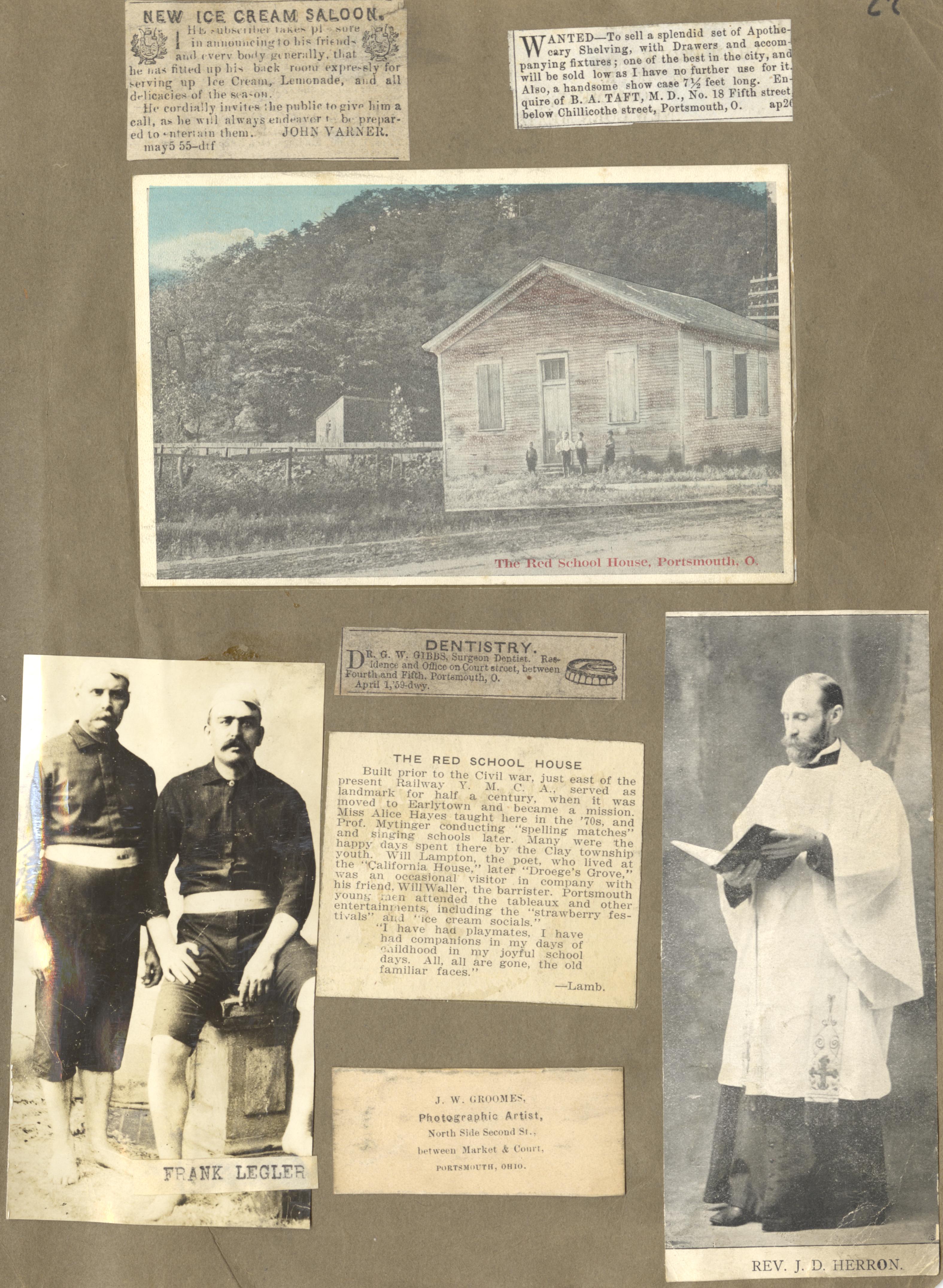 Henry A. Lorberg, “Red School House; Frank Legler; Rev. J. D. Herron; business ads and clippings,” Scioto County Public Library Local History Digital Collection, accessed December 6, 2025, https://www.sciotolibrary.org/history/items/show/21895.