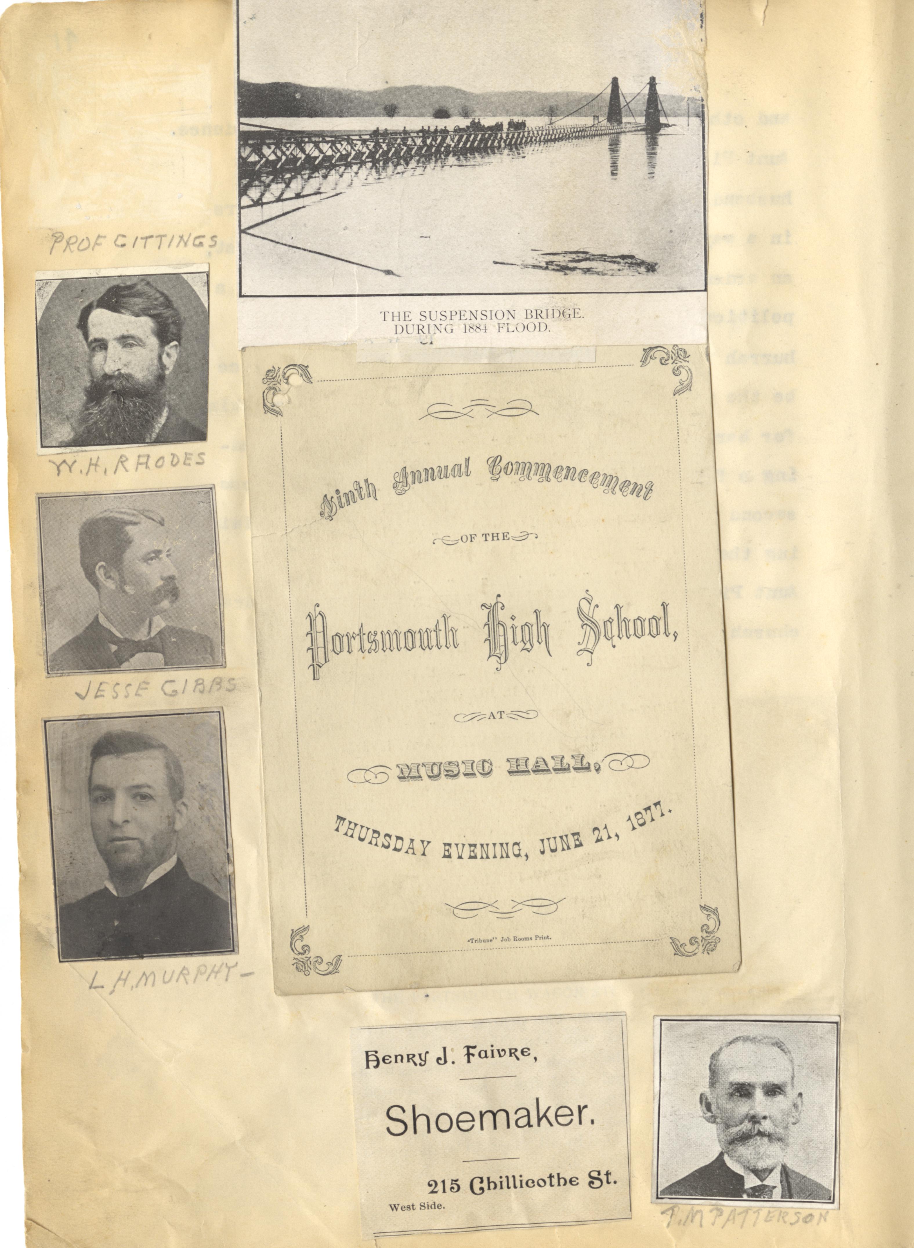 Henry A. Lorberg, “W. H. Rhodes; Jesse Gibbs; L. H. Murphy; The Suspension Bridge During the 1884 Flood; T. M. Patterson; PHS Commencement; Henry J. Faivre,” Scioto County Public Library Local History Digital Collection, accessed December 6, 2025, https://www.sciotolibrary.org/history/items/show/21924.
