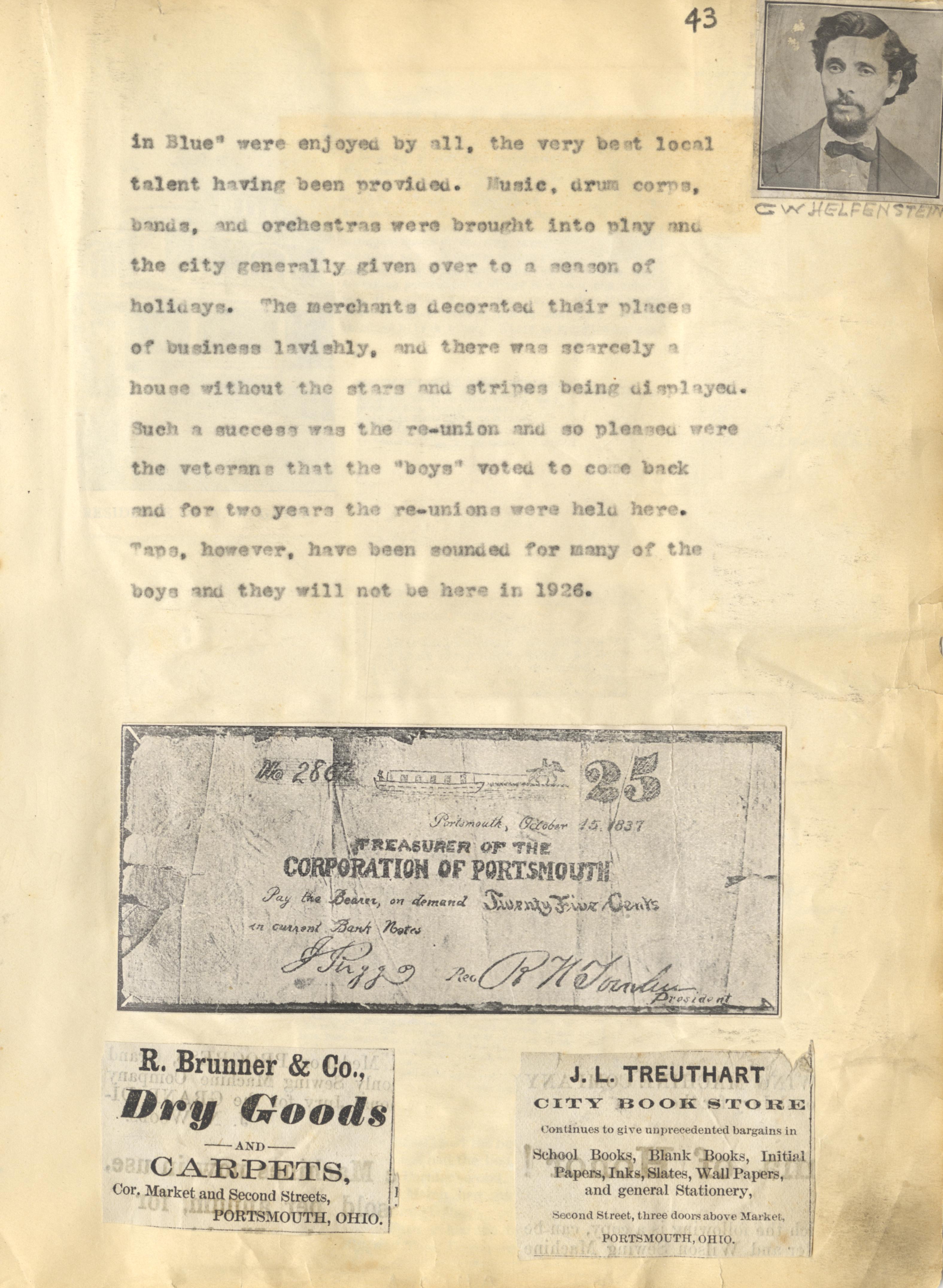 - Scanned page 43 from Henry A. Lorberg scrapbook containing a typed text narrative about military reunions in Portsmouth. A black & white image of C. W. Helfenstein. A copy of a note from the Treasurer of the Corporation of Portsmouth. Business clippings for R. Brunner & Co., Dry Goods and J. L. Treuthart, City Bookstore.