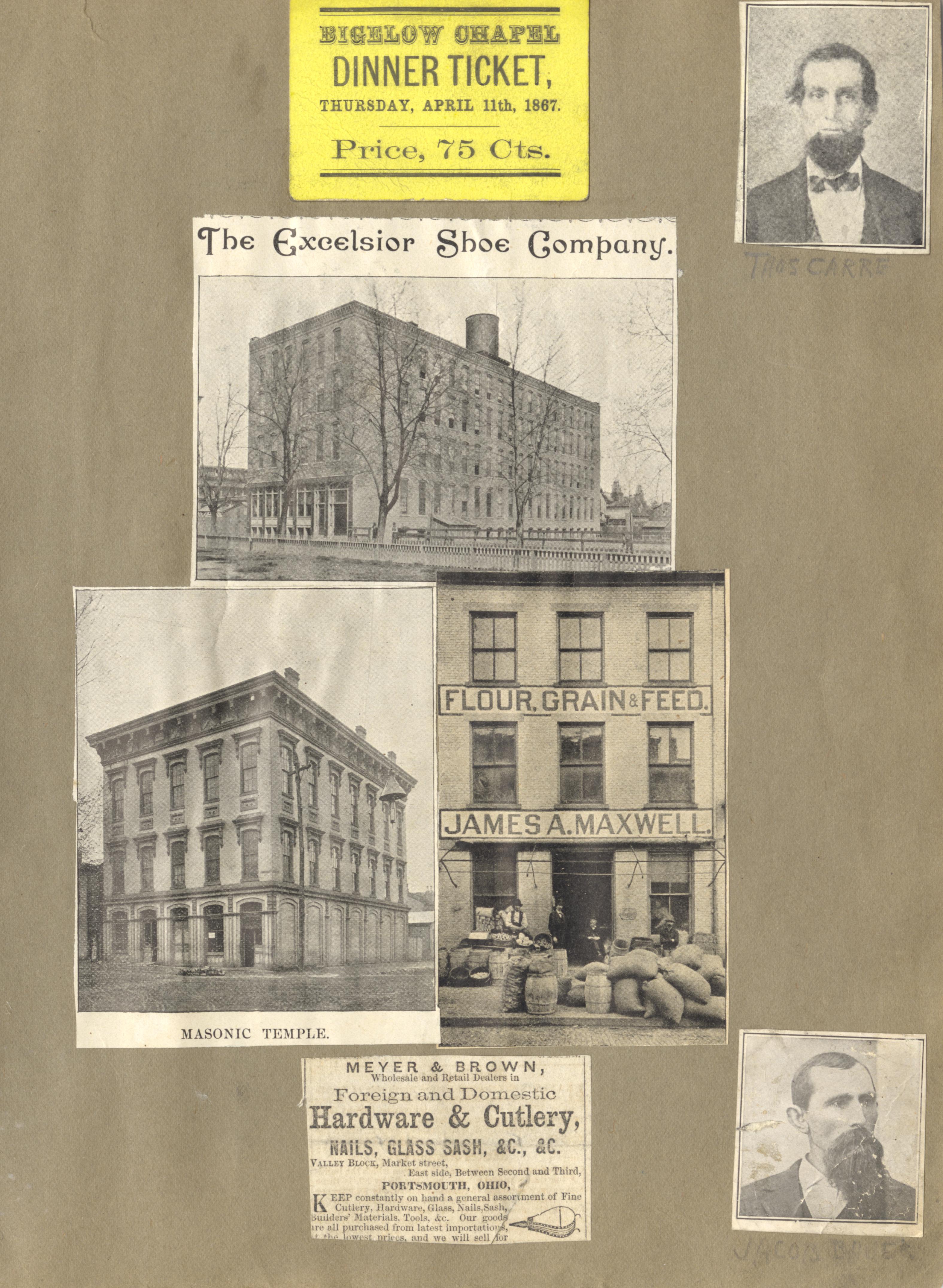 Henry A. Lorberg, “Bigelow Chapel Dinner Ticket; Thomas Carre; The Excelsior Shoe Company; The old Masonic Temple; James A. Maxwell: Flour, Grain & Feed; and Jacob Bower; Meyer & Brown Hardware & Cutlery,” Scioto County Public Library Local History Digital Collection, accessed December 13, 2025, https://www.sciotolibrary.org/history/items/show/21939.