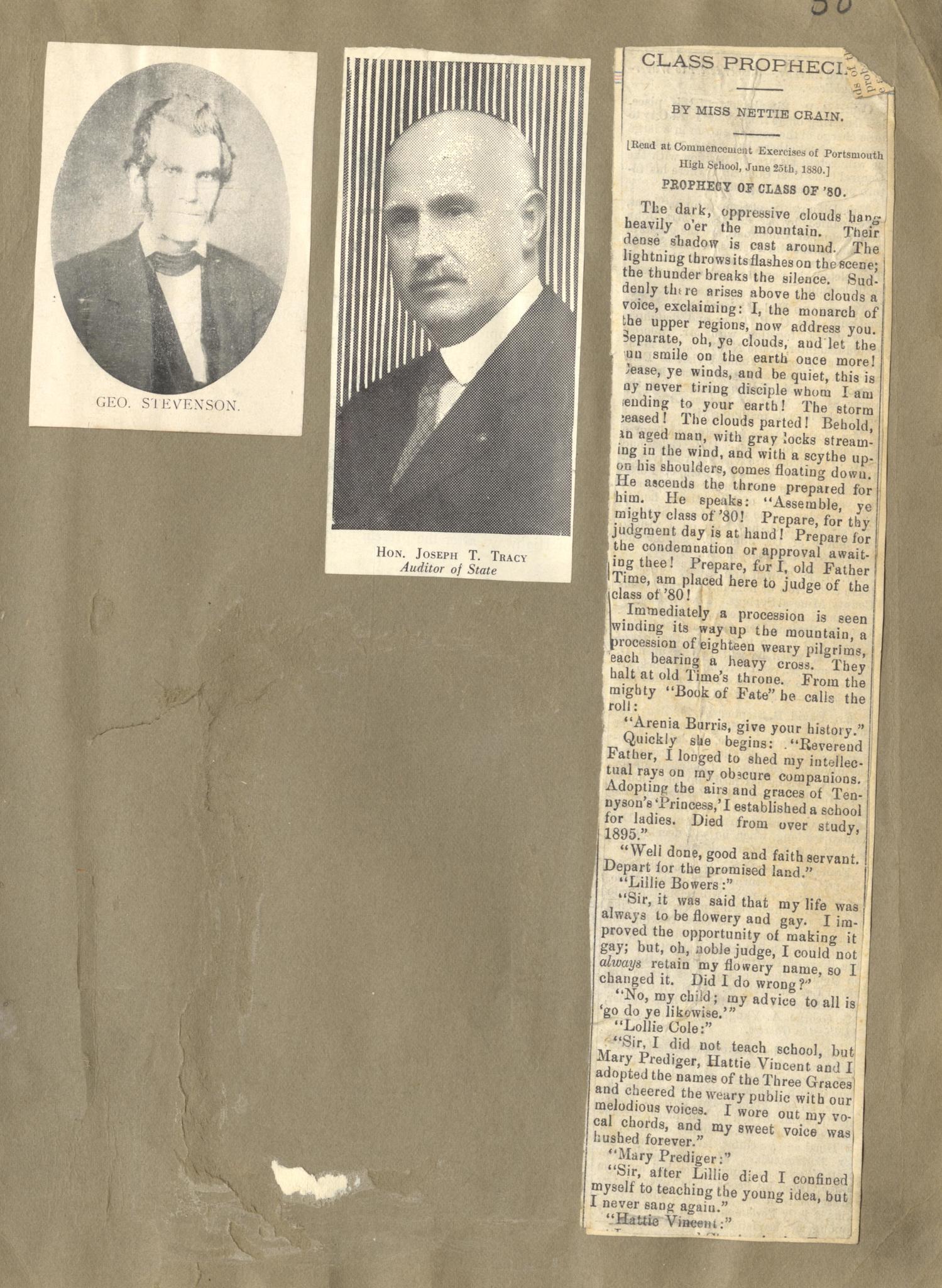 - Scanned page 30 from Henry A. Lorberg scrapbook containing black & white images of George Stevenson; Honorable Joseph T. Tracy. Clipping from newspaper of Class Prophecies for the class of 1880 by Nettie Crain