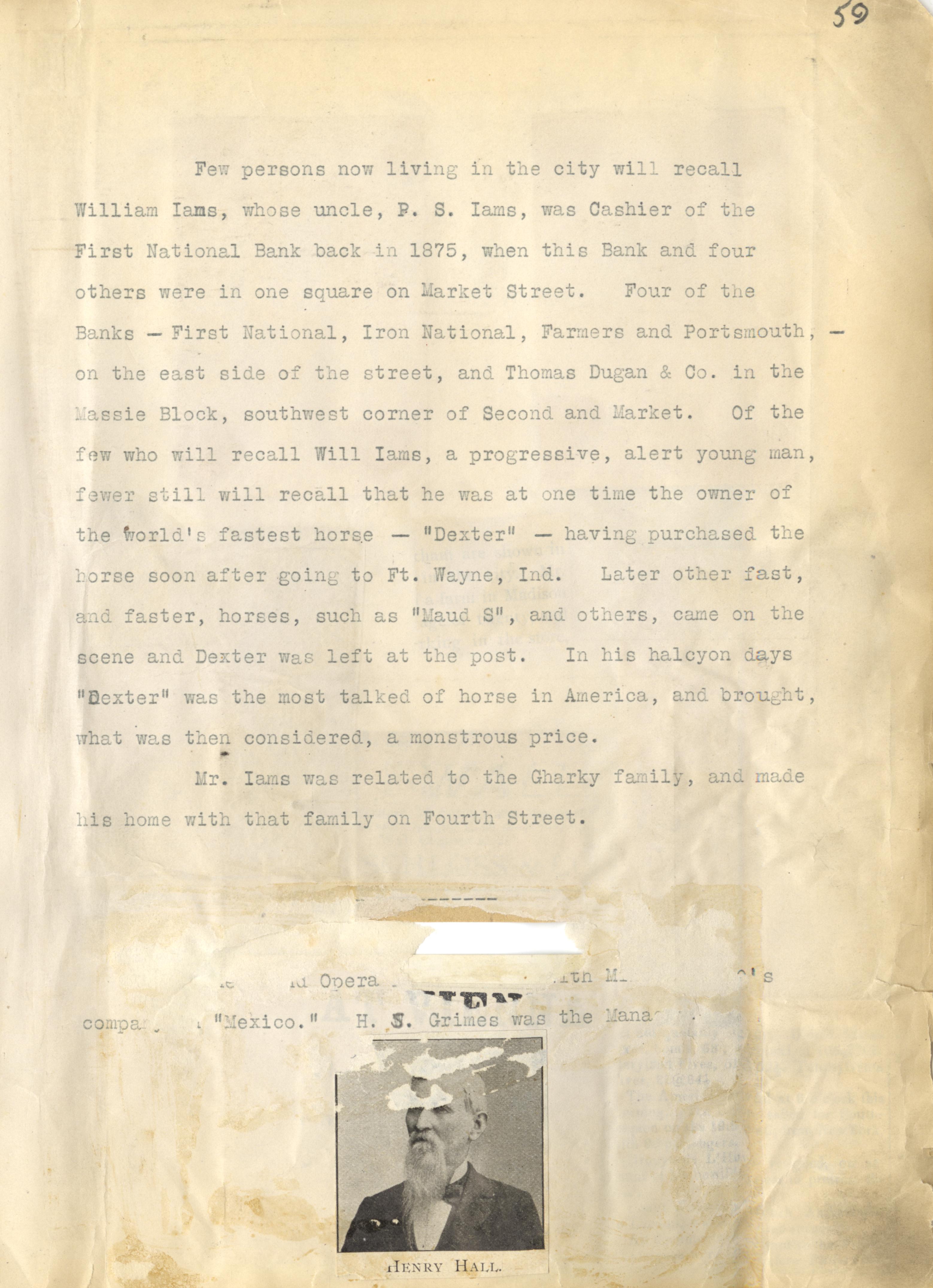 - Scanned page 59 from Henry A. Lorberg scrapbook containing a typed text narrative of William Iams and a black & white image of Henry Hall.