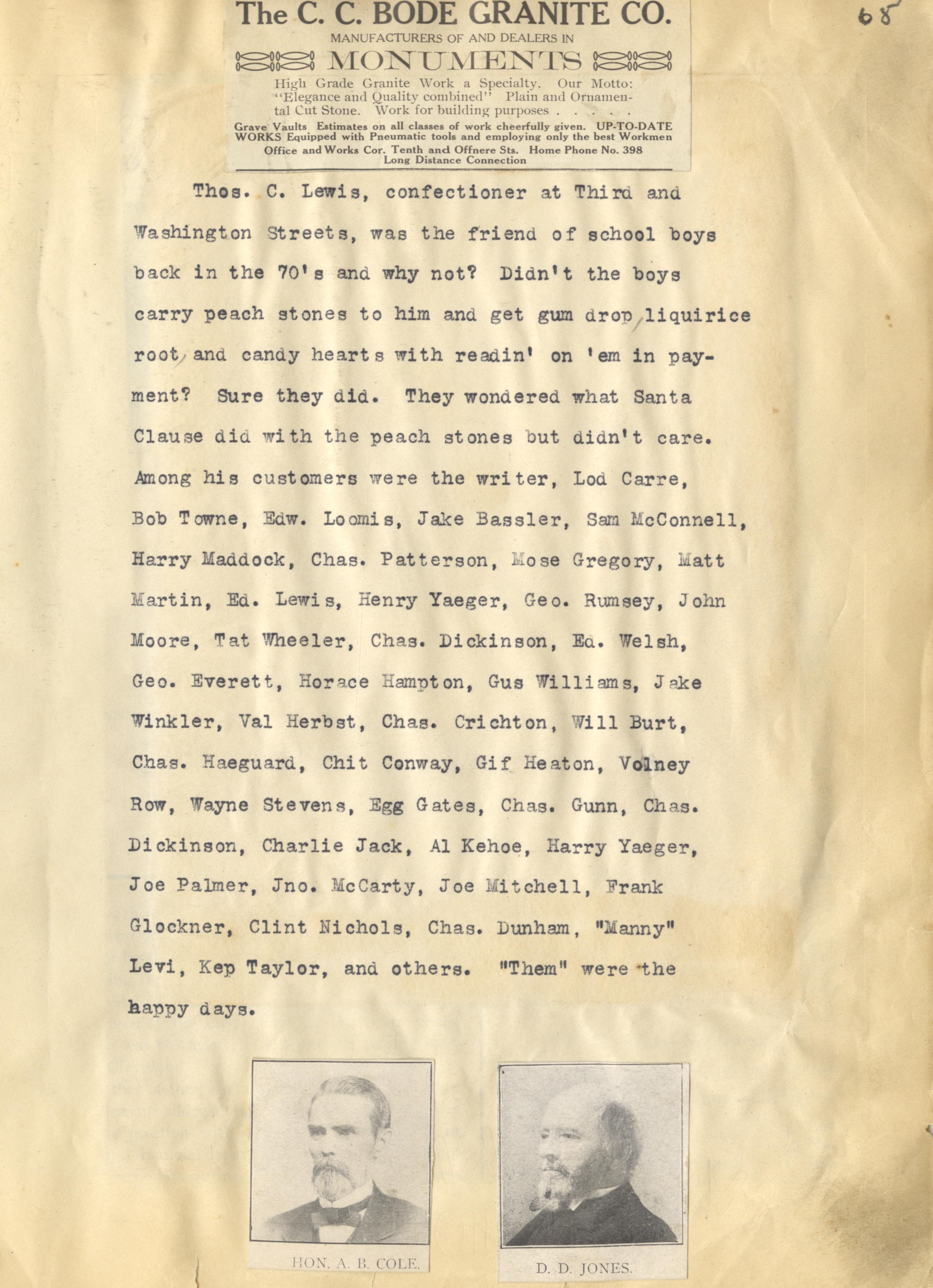 - Scanned page 65 from Henry A. Lorberg scrapbook containing a typed text account of Thomas C. Lewis, confectioner. Black & white images of Honorable A. B. Cole; D. D. Jones. Business clipping for the C. C. Bode Granite Company