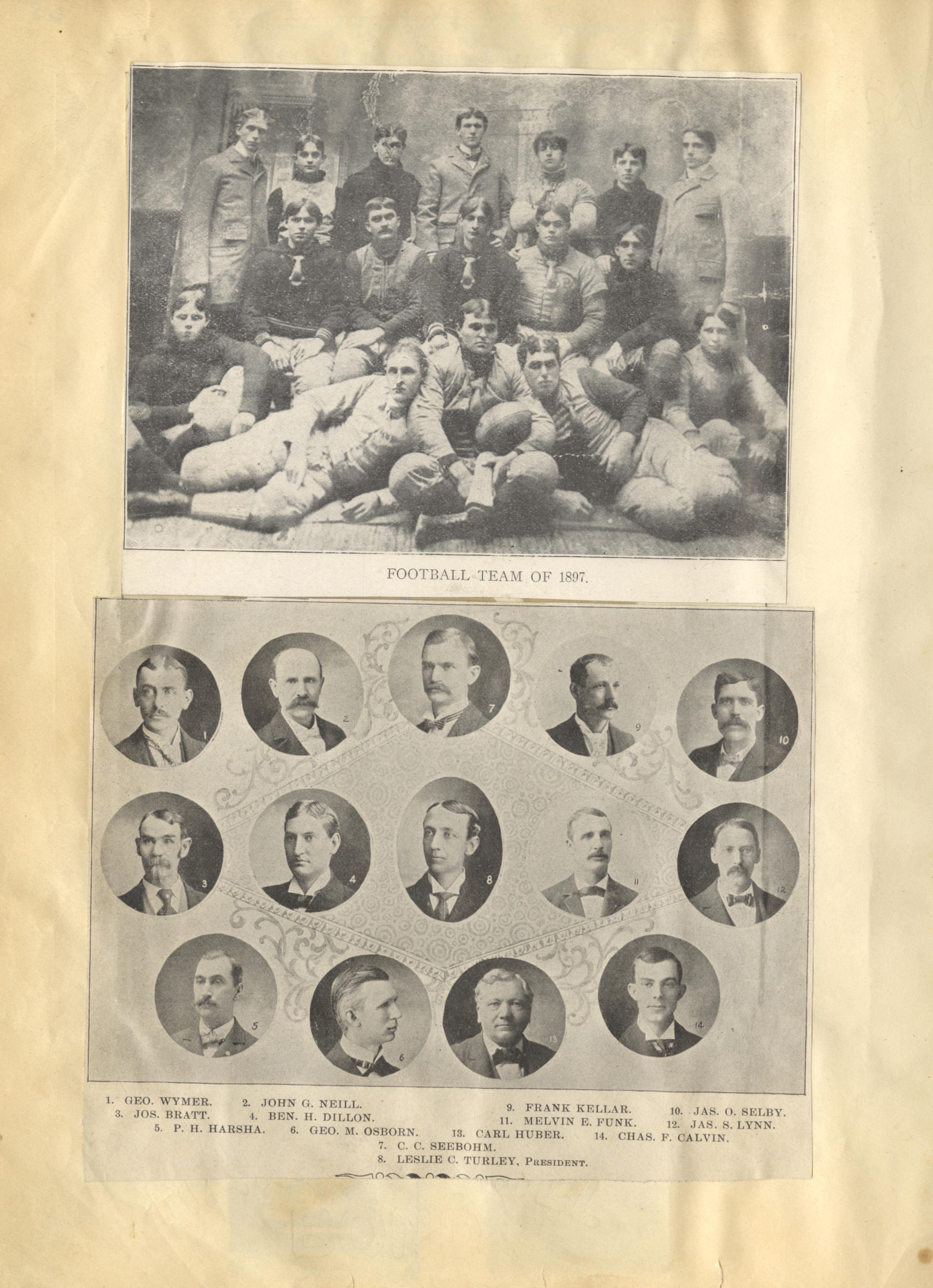- Scanned unnumbered page from Henry A. Lorberg scrapbook containing black & white image of the Football team of 1897 and black & white set of images of the City Fathers: George Wymer; John G. Neill; Joseph Bratt; Benjamin H. Dillon; P. H. Harsha; George M. Osborn; C. C. Seebohm; Leslie C. Turley, President; Rank Kellar; James O. Selby; Melvin E. Funk; James S. Lynn; Carl Huber; Charles F. Calvin.