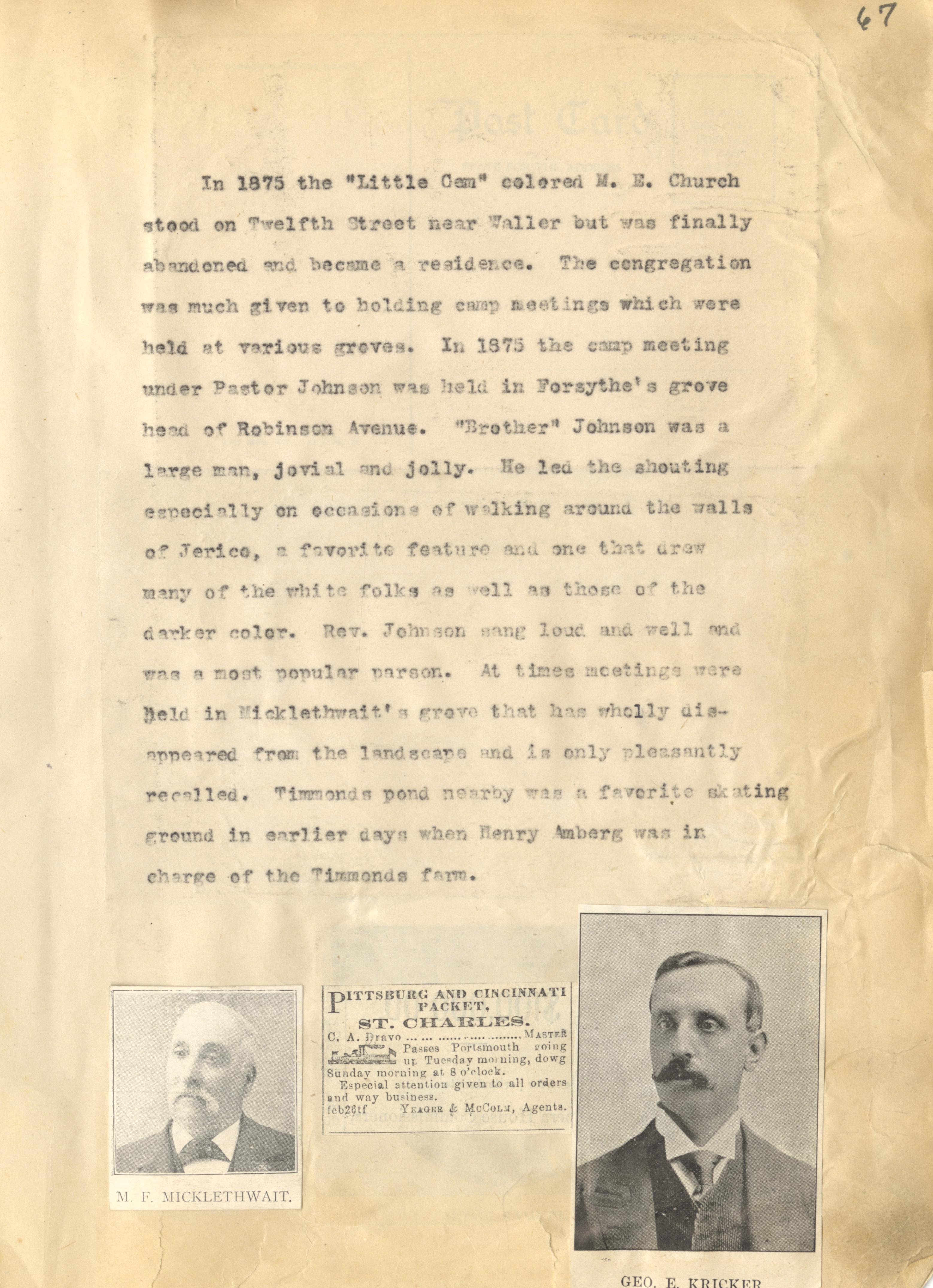 - Scanned page 67 from Henry A. Lorberg scrapbook containing a typed text narrative about the colored M. E. Church. Black & white images of M. F. Micklethwait; George E. Kricker. Business clipping for Pittsburg and Cincinnati Packet