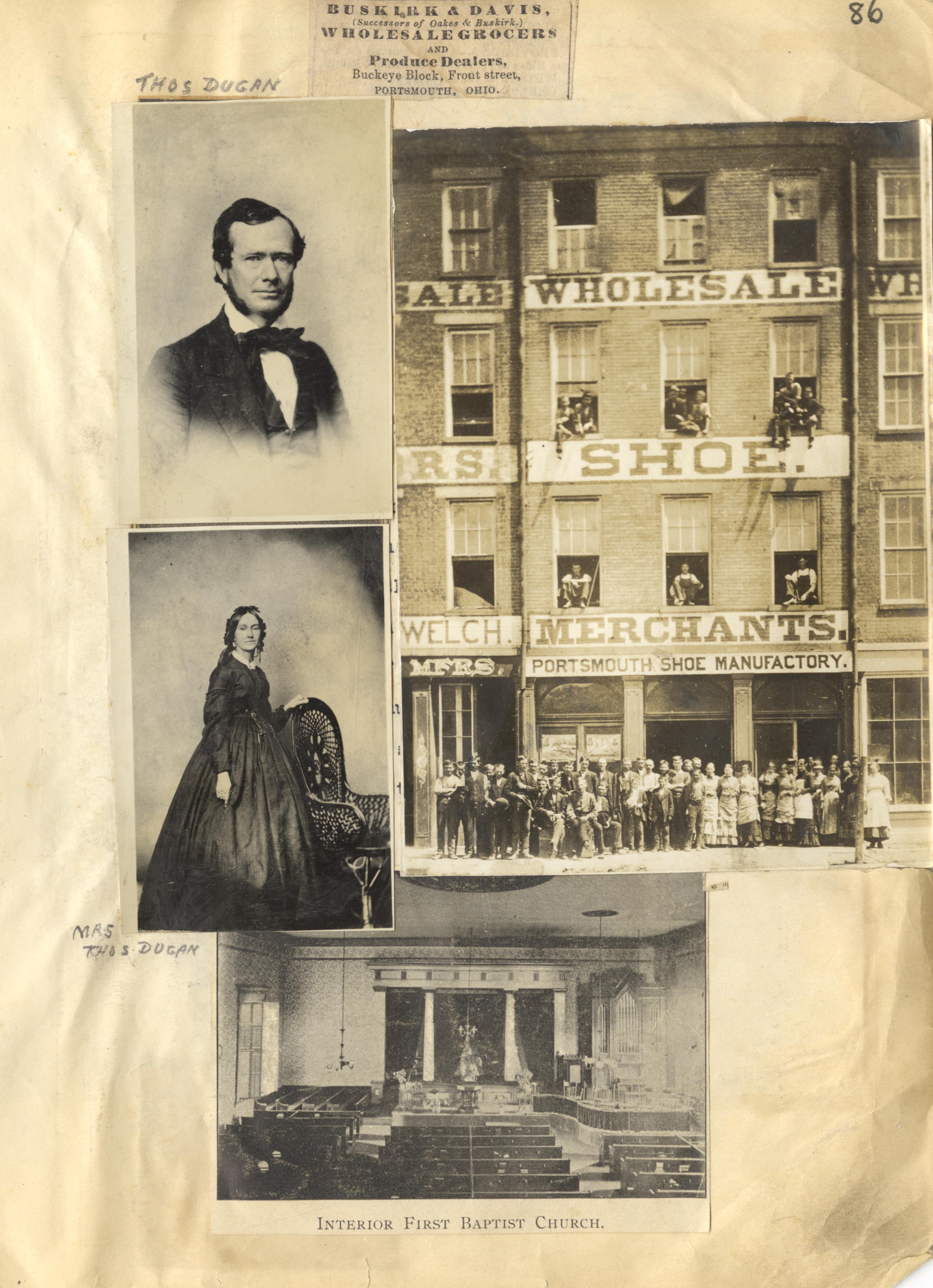 Henry A. Lorberg, “Thomas Dugan; Mrs. Thomas Dugan; Interior First Baptist church; Portsmouth Shoe Manufactory,” Scioto County Public Library Local History Digital Collection, accessed December 13, 2025, https://www.sciotolibrary.org/history/items/show/22011.