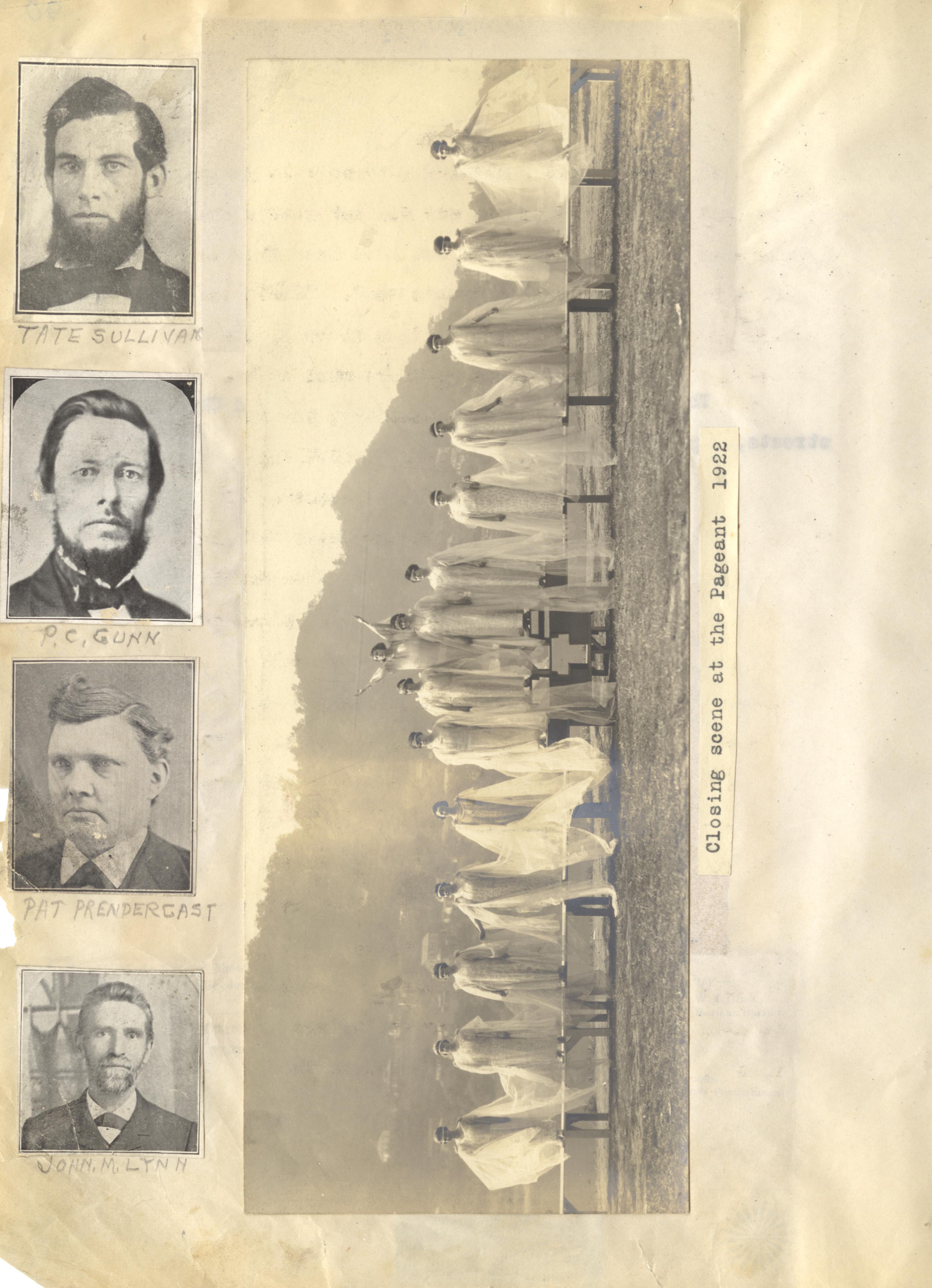 - Scanned unnumbered page from Henry A. Lorberg scrapbook containing black & white images of Tate Sullivan; P. C. Gunn; Pat Prendergast; John M. Lynn; Closing Scene at the Pageant, 1922