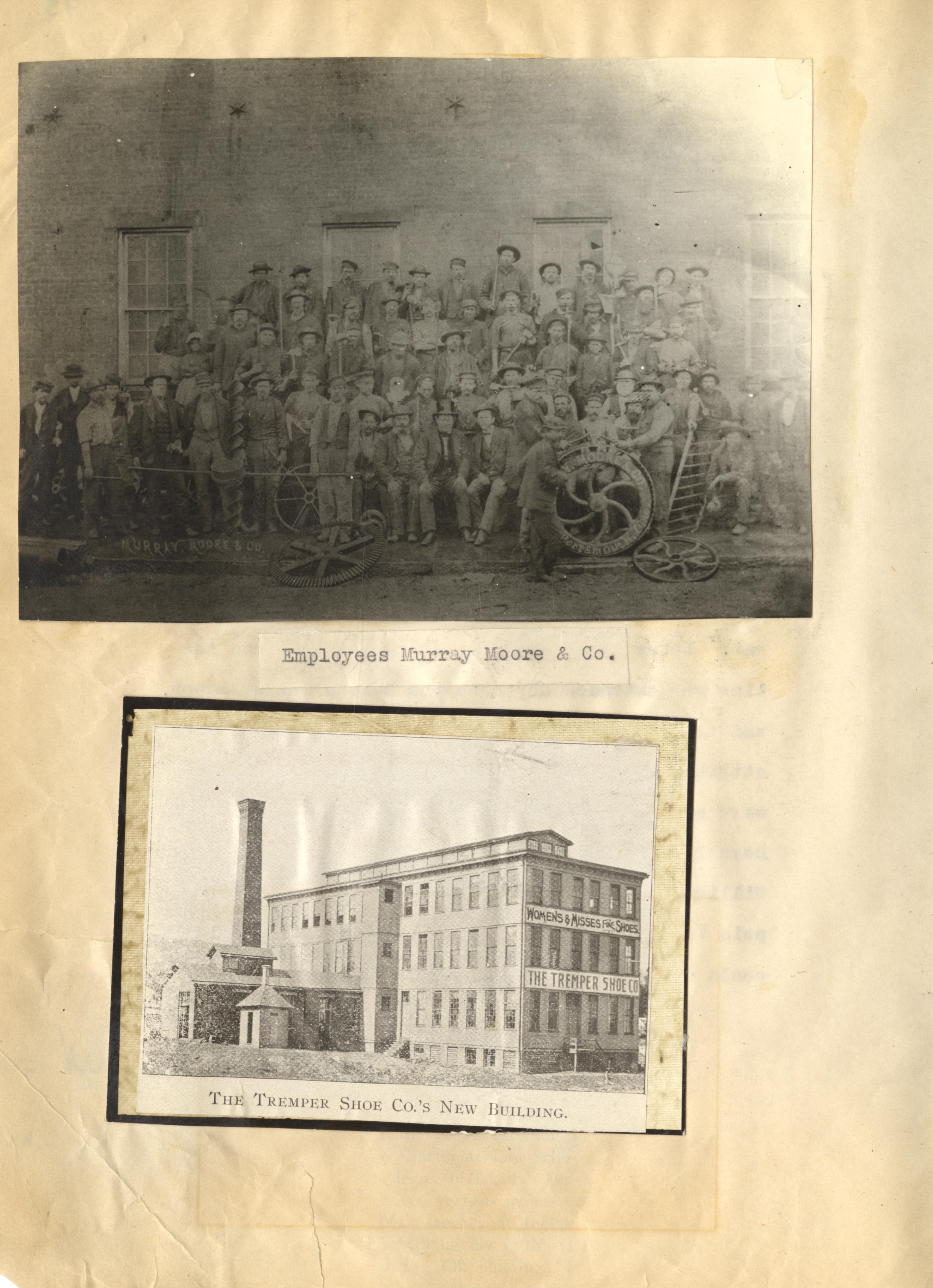 - Scanned unnumbered page from Henry A. Lorberg scrapbook containing black & white images of Employees Murray Moore & Co.; and The Tremper Shoe Co.'s new building.
