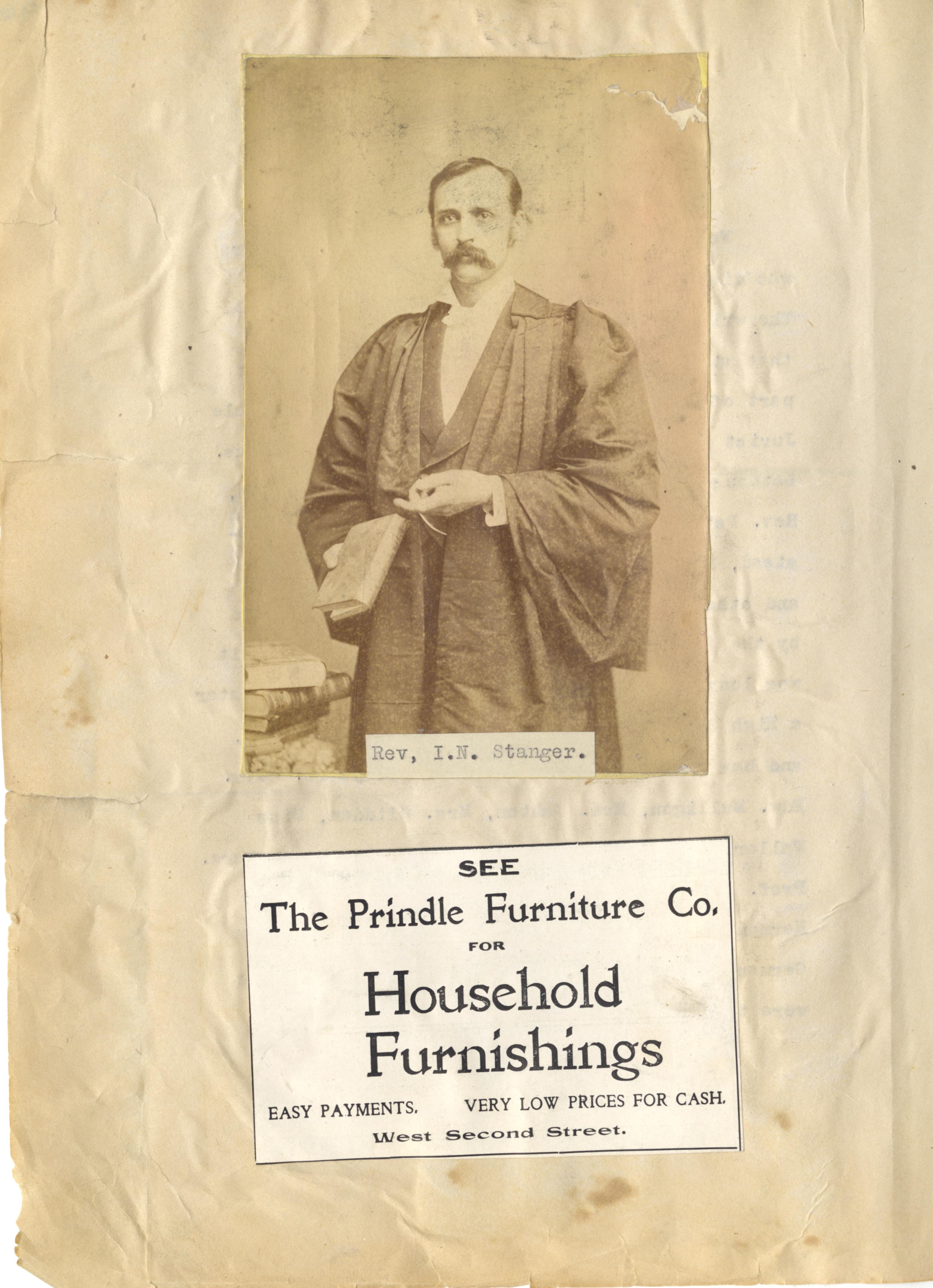 - Scanned unnumbered page from Henry A. Lorberg scrapbook containing a black & white image of Rev. I. N. Stranger; and a business clipping for Prindle Furniture Co.