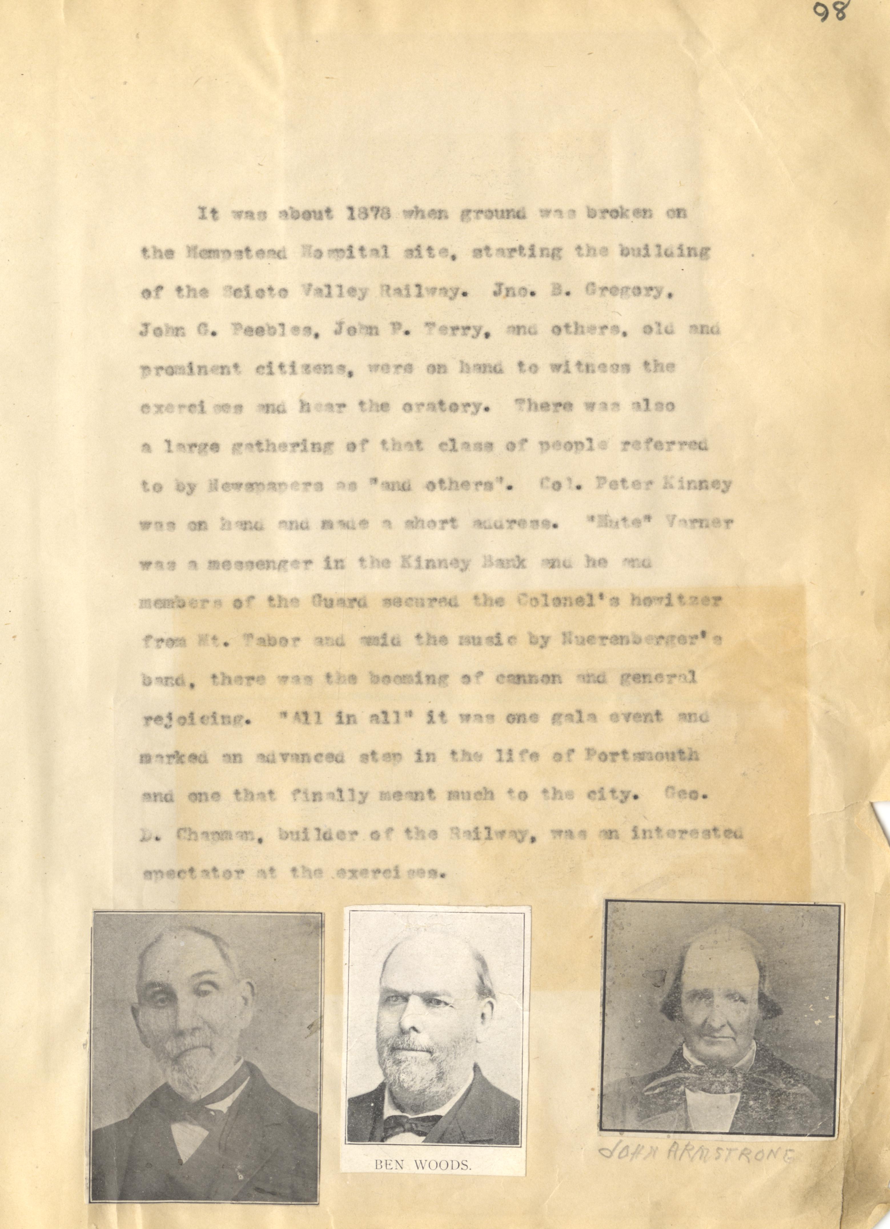 - Scanned page 98 from Henry A. Lorberg scrapbook containing a typed text narrative about Hempstead Hospital. John Gregory; Scioto Valley Railway; John G. Peebles; John P. Terry; Colonel Peter Kinney; Mute Varner; Mt. Tabor; George D. Chapman