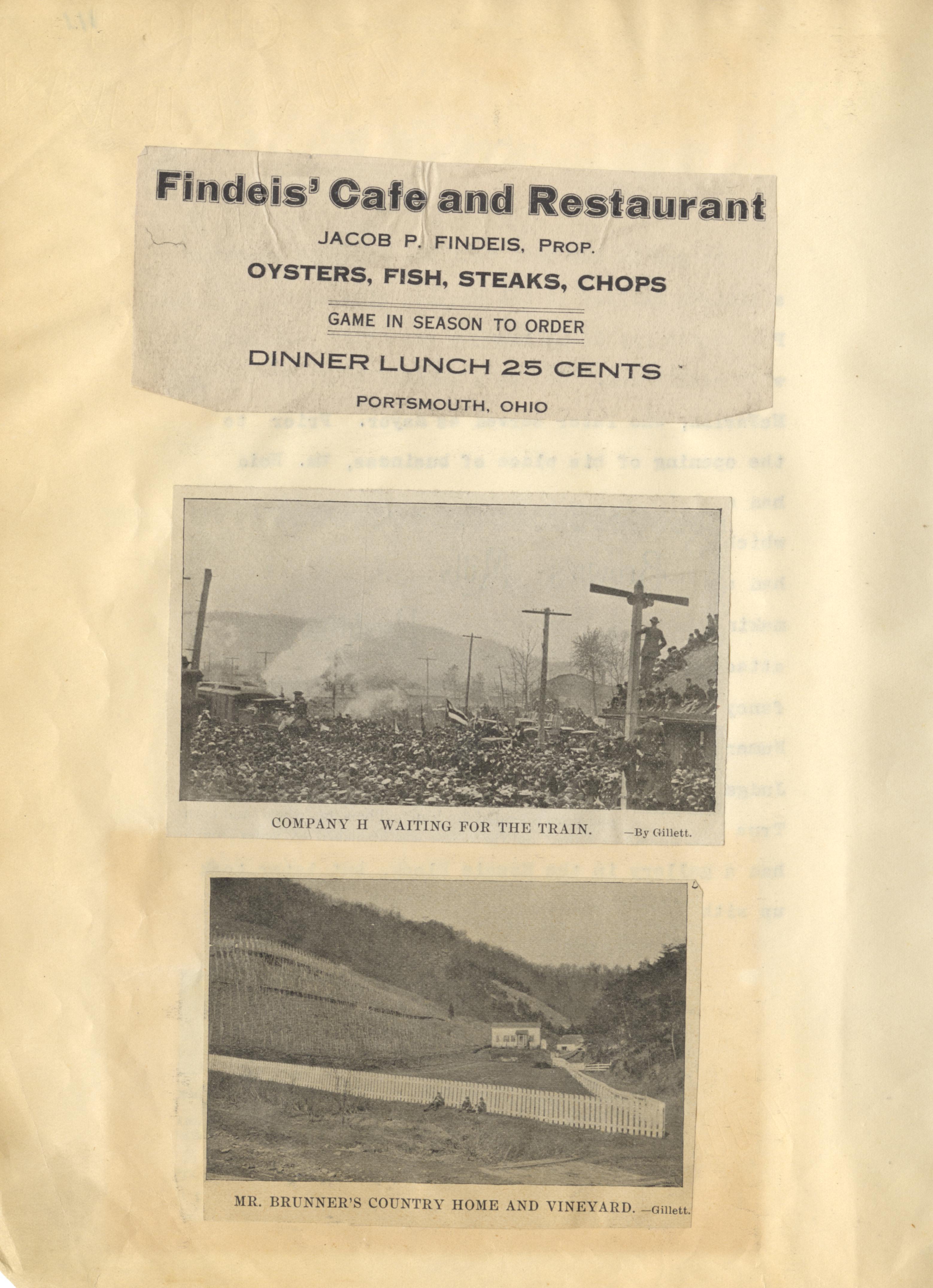 Henry A. Lorberg, “Findeis' Cafe and Restaurant; Company H. Waiting for the Train; Mr. Brunner's Country home and Vineyard,” Scioto County Public Library Local History Digital Collection, accessed December 14, 2025, https://www.sciotolibrary.org/history/items/show/22062.