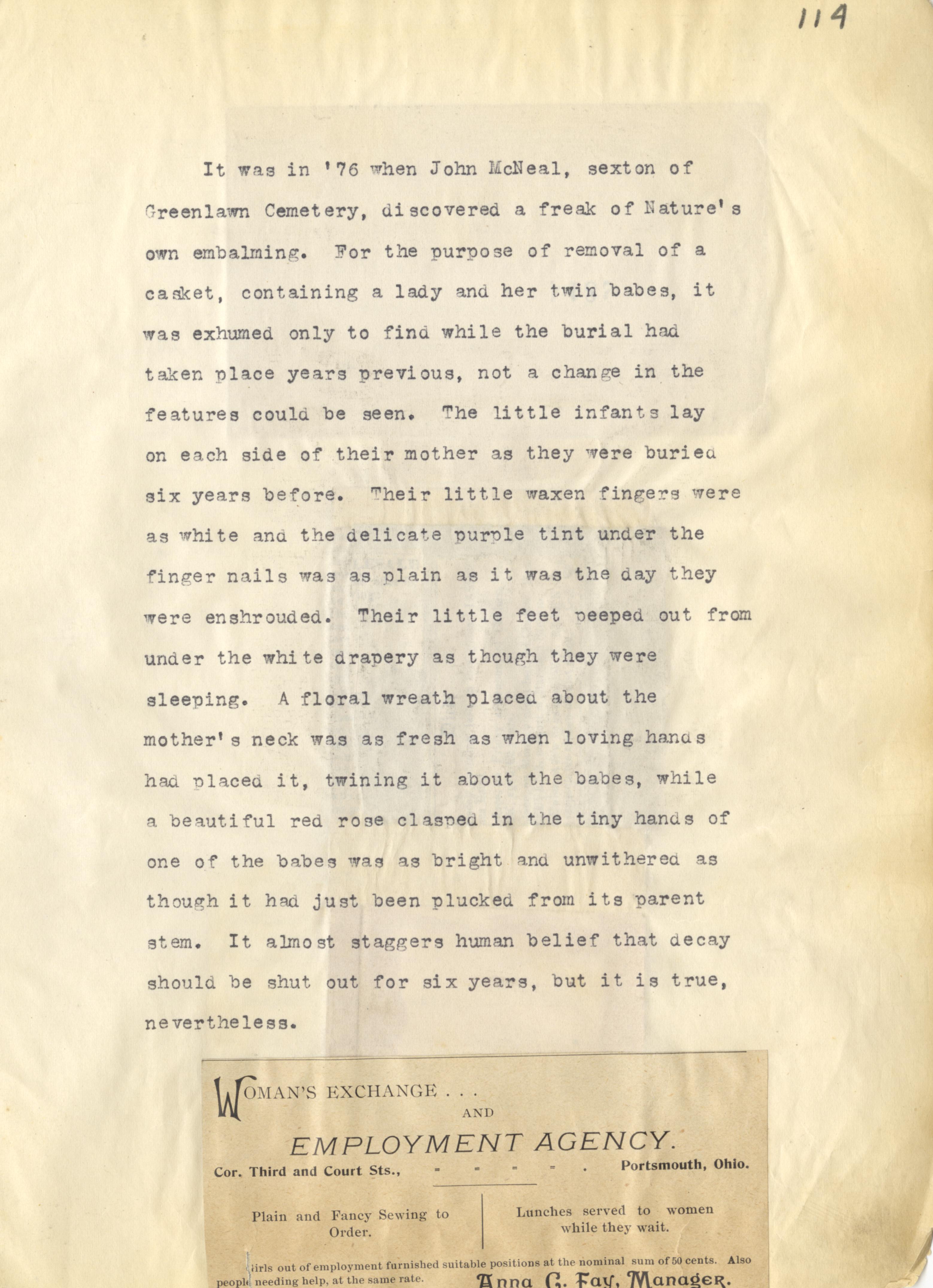 - Scanned page 114 from Henry A. Lorberg scrapbook containing typed text about a sexton (John McNeal) of Greenlawn Cemetery who removed the coffin of a woman and her twin babies whose bodies were perfectly preserved after 6 years.