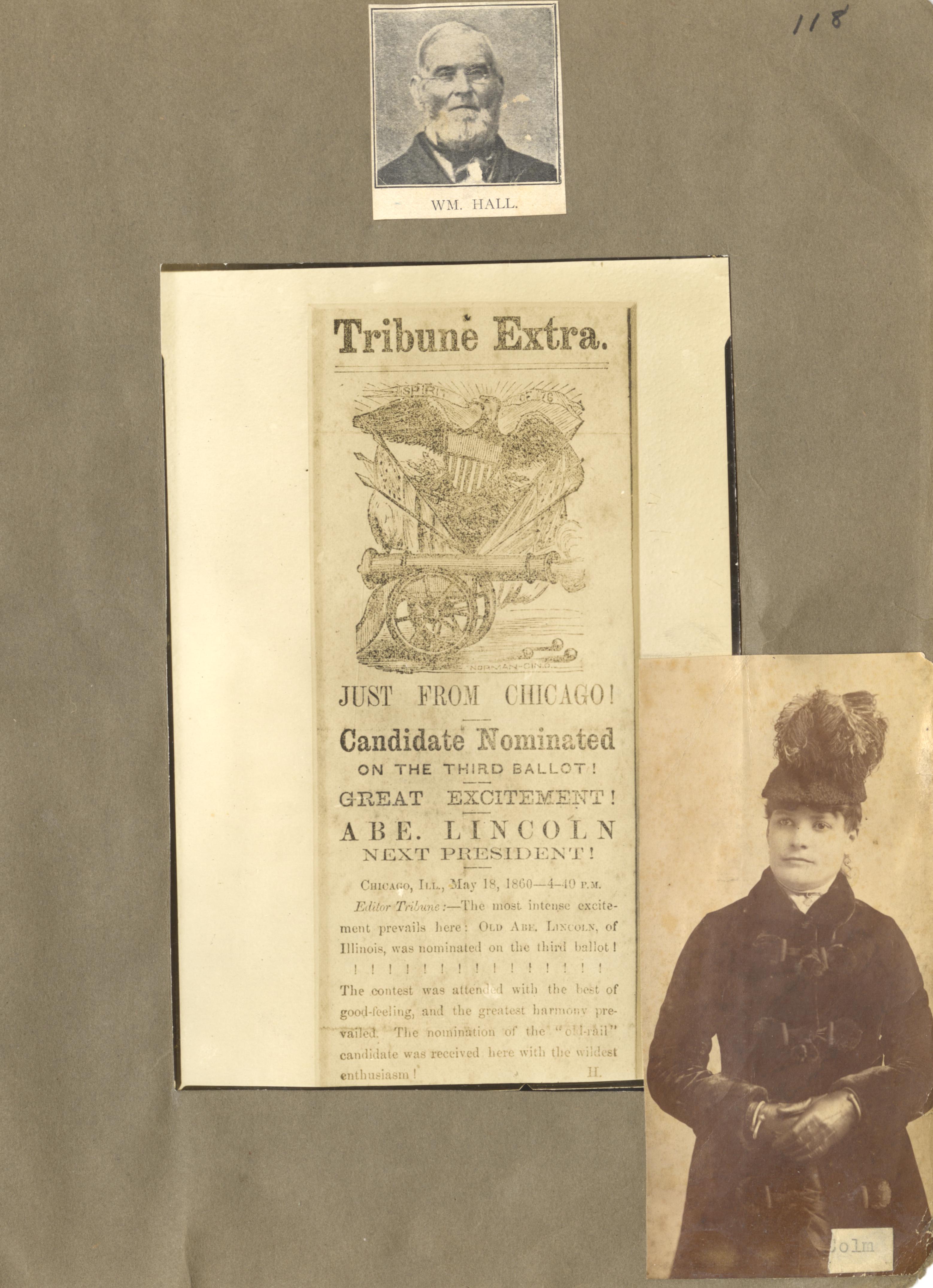 - Scanned page 118 from Henry A. Lorberg scrapbook containing a black & white image of Wm. Hall; and an unidentified woman. A newspaper clipping for Tribune Extra announcing the nomination of Abe Lincoln.