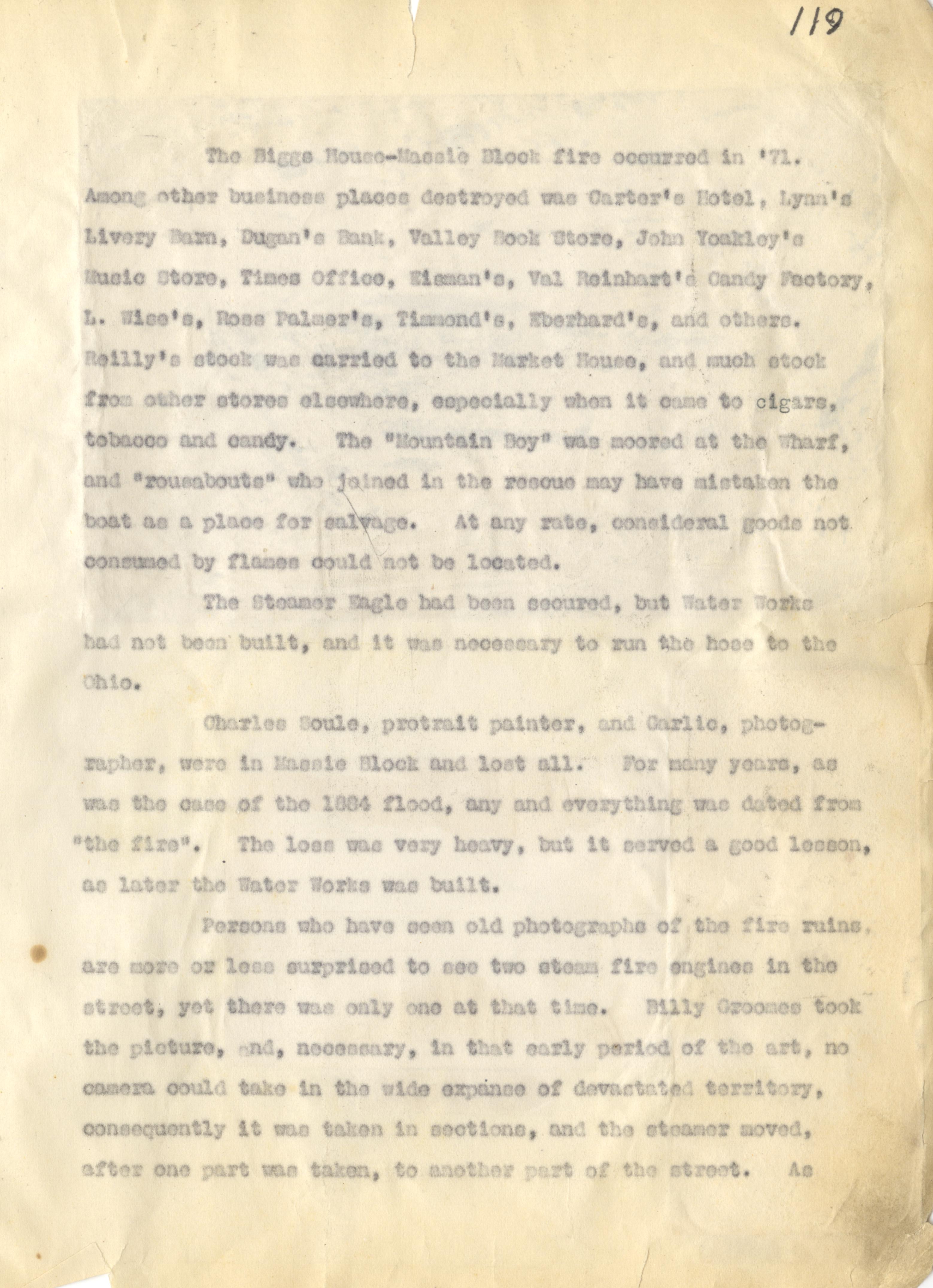 - Scanned page 119 from Henry A. Lorberg scrapbook containing a typed text narrative about a fire at the Biggs House-Massie Block in 1871.