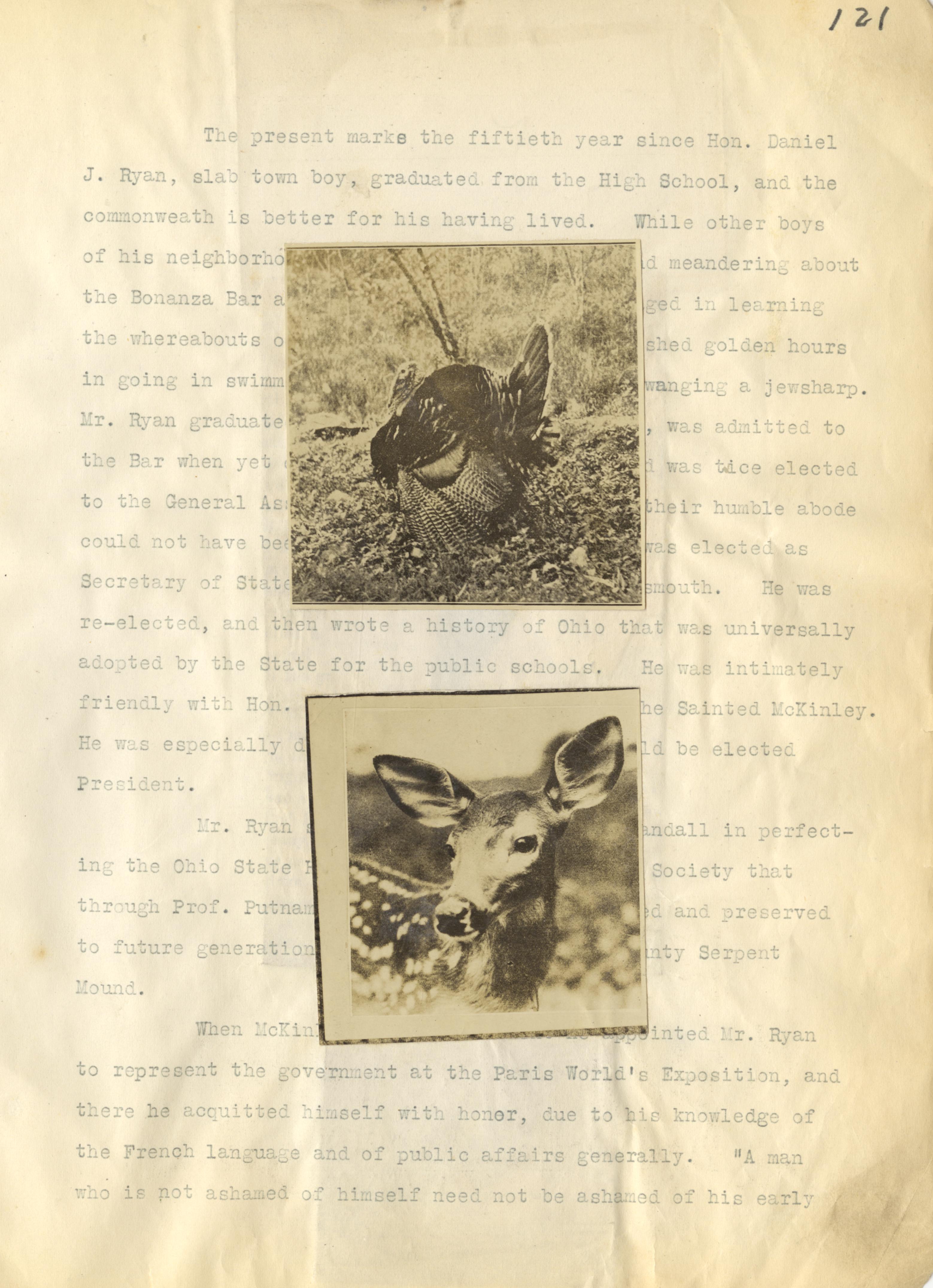 - Scanned page 121 from Henry A. Lorberg scrapbook containing sepia images of a turkey and a deer.