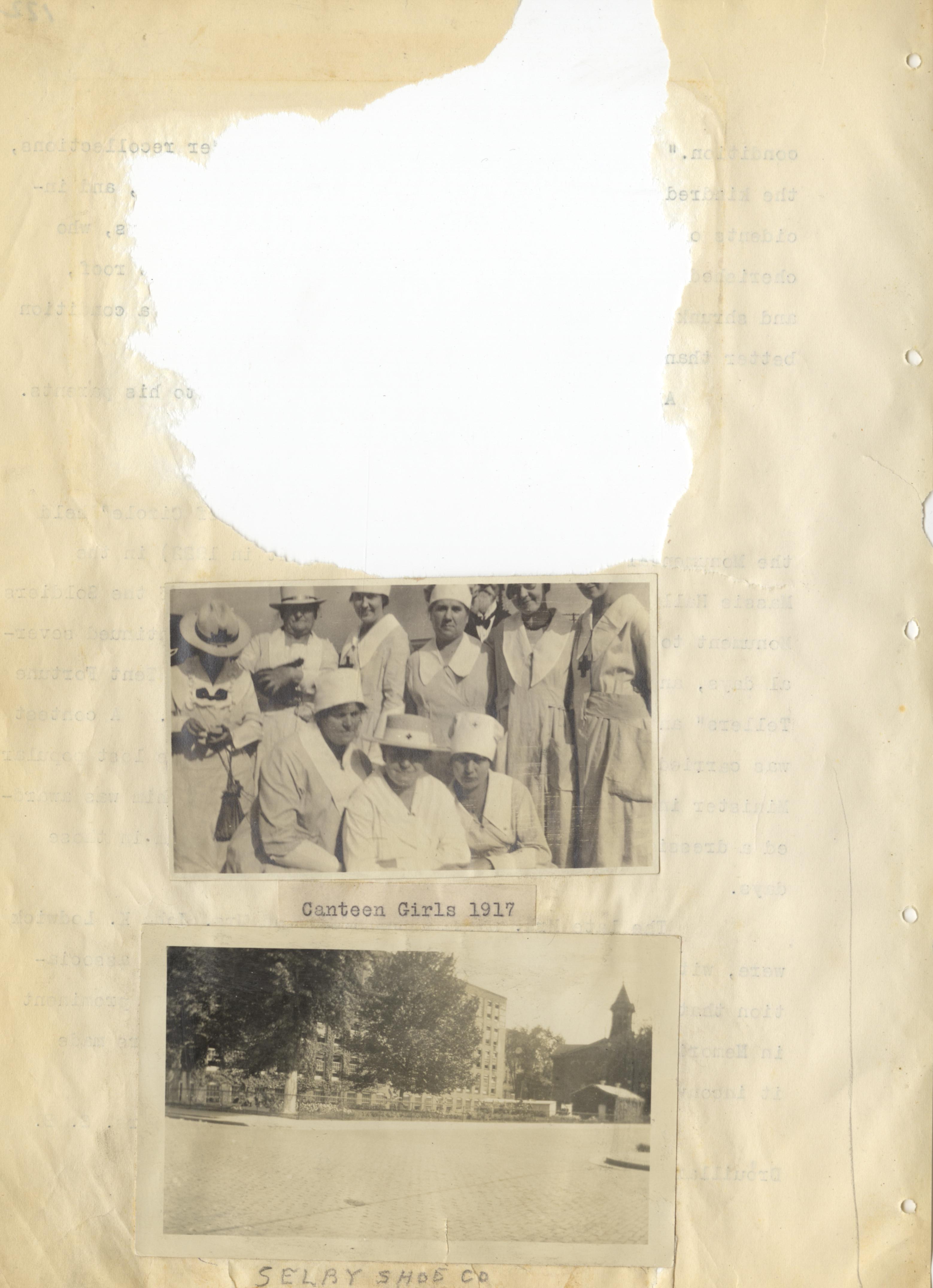 - Scanned unnumbered page from Henry A. Lorberg scrapbook containing black & white images of Canteen Girls, 1917; Selby Shoe Co.