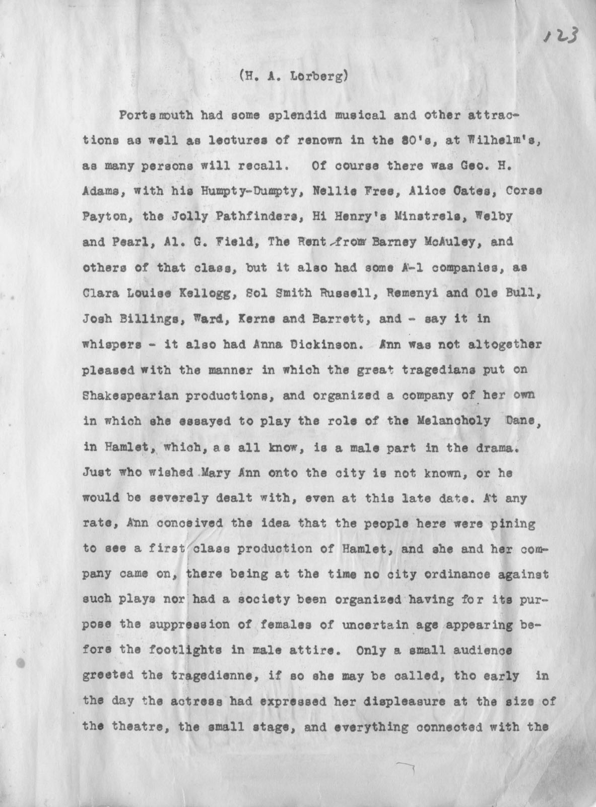 - Scanned page 123 from Henry A. Lorberg scrapbook containing a typed text account of some of the attractions that came to Wilhelm's Opera House in the 1880s.