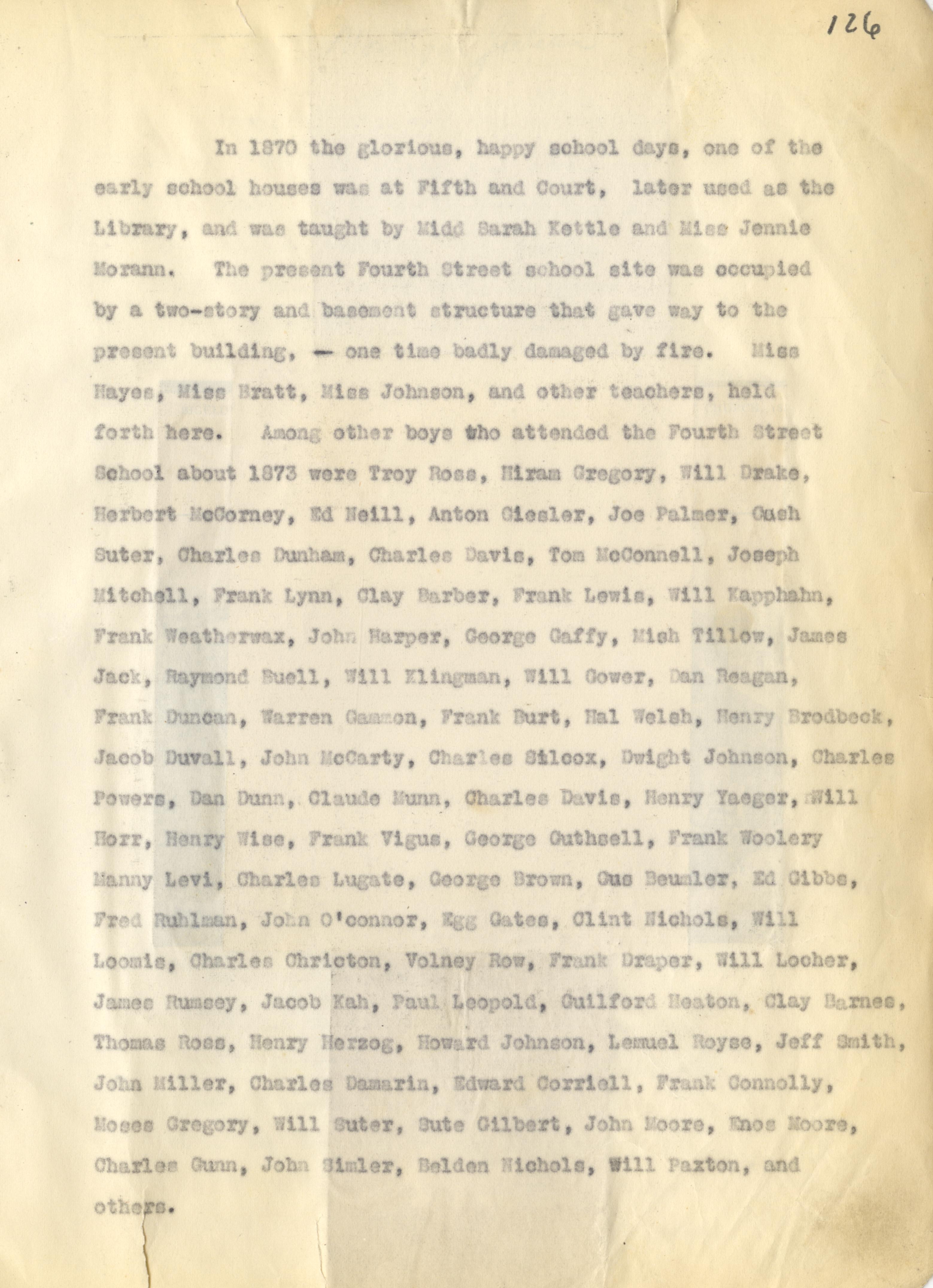 - Scanned page 126 from Henry A. Lorberg scrapbook containing a typed text narrative about early school houses. Miss Sarah Kettle; Jennie Mrann; Miss Hayes; Miss Bratt; Miss Johnson; Troy Ross; Hiram Gregory; Will Drake; Herbert McGorney; Ed Neill; Anton Giesler; Joe Palmer; Gash Suter; Charles Dunham; Charles Davis; Tom McConnell; Joseph Mitchell; Frank Lynn; Clay Barber; Frank Lewis; Will Kapphahn; Frank Weatherwax; John Harper; George Gaffy; Mish Tillow; James Jack; Raymond Buell; Will Klingman; Will Gower; Dan Reagan; Frank Duncan; Warren Gammon; Frank Burt; Hal Welsh; Henry Brodbeck; Jacob Duvall; John McCarty; Charles Silcox; Dwight Johnson; Charles Powers; Dan Dunn; Claude Munn; Charles dAvis; Henry Yaeger; Will Horr; Henry Wise; Frank Vigus; George Guthsell; Frank Woolery; Manny Levi; Charles Lugate; George Brown; Gus Beumler; Ed Gibbs; Fred Ruhlman; John O' Connor; Egg Gates; Clint Nichols; Will Loomis; Charles Chricton (Crichton); Volney Row; Frank Draper; Will Locher; James Rumsey; Jacob Kah; Paul Leopold; Guilford Heaton; Clay Barnes; Thomas Ross; Henry Herzog; Howard Johnson; Lemuel Royse; Jeff Smith; John Miller; Charles Damarin; Edward Corriell; Frank Connolly; Moses Gregory; Will Suter; Sute Gilbert; John Moore; Enos Moore; Charles Gunn; John Simler; Beldon Nichols; Will Paxton