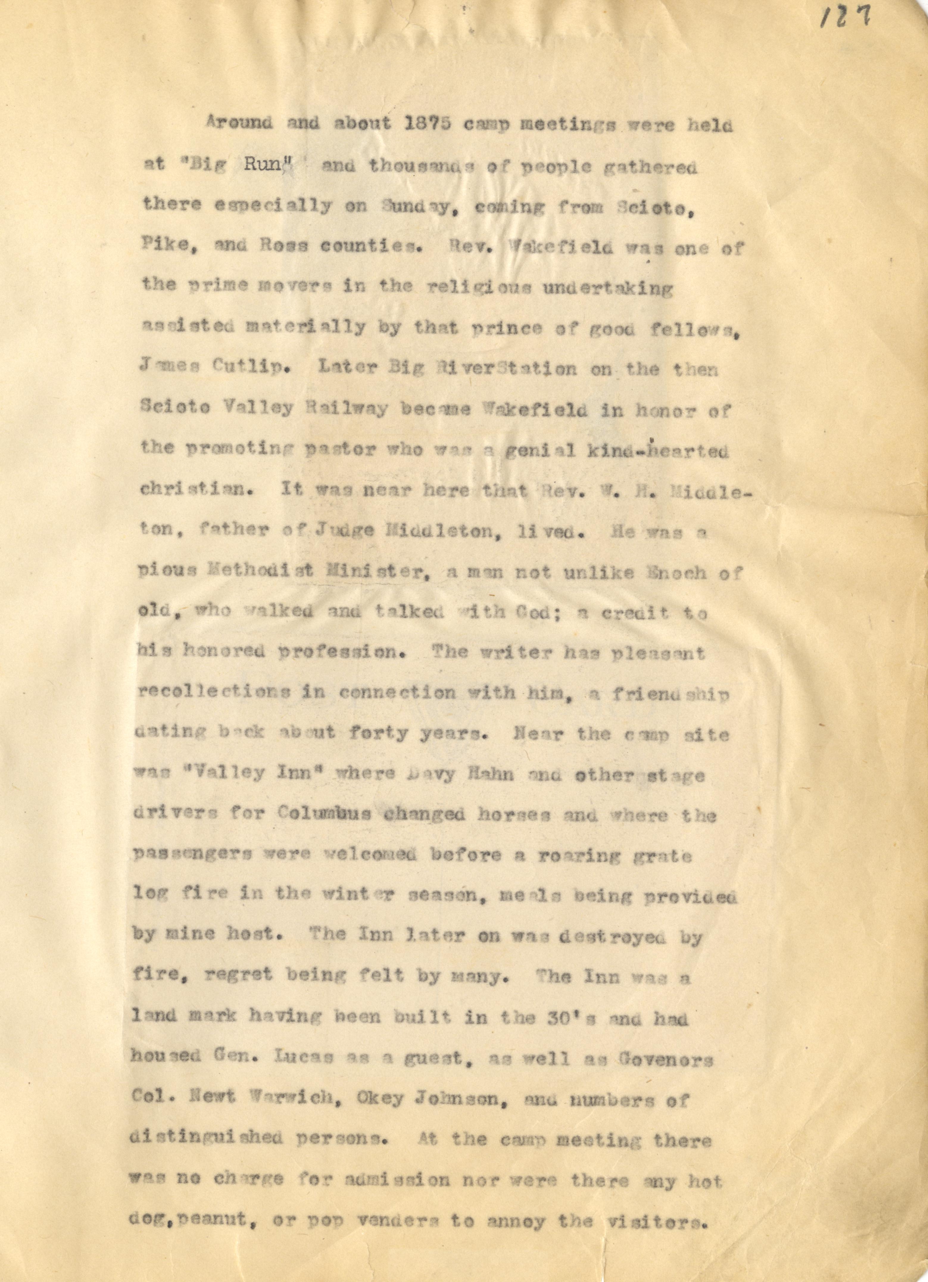- Scanned page 127 from Henry A. Lorberg scrapbook containing a typed text narrative about Big Run camp meetings held by churches. Reverend Wakefield; Judge Middleton; Reverend W. H. Middleton; Davy Hahn; the Inn; Colonel Newt Warwich; Okey Johnson