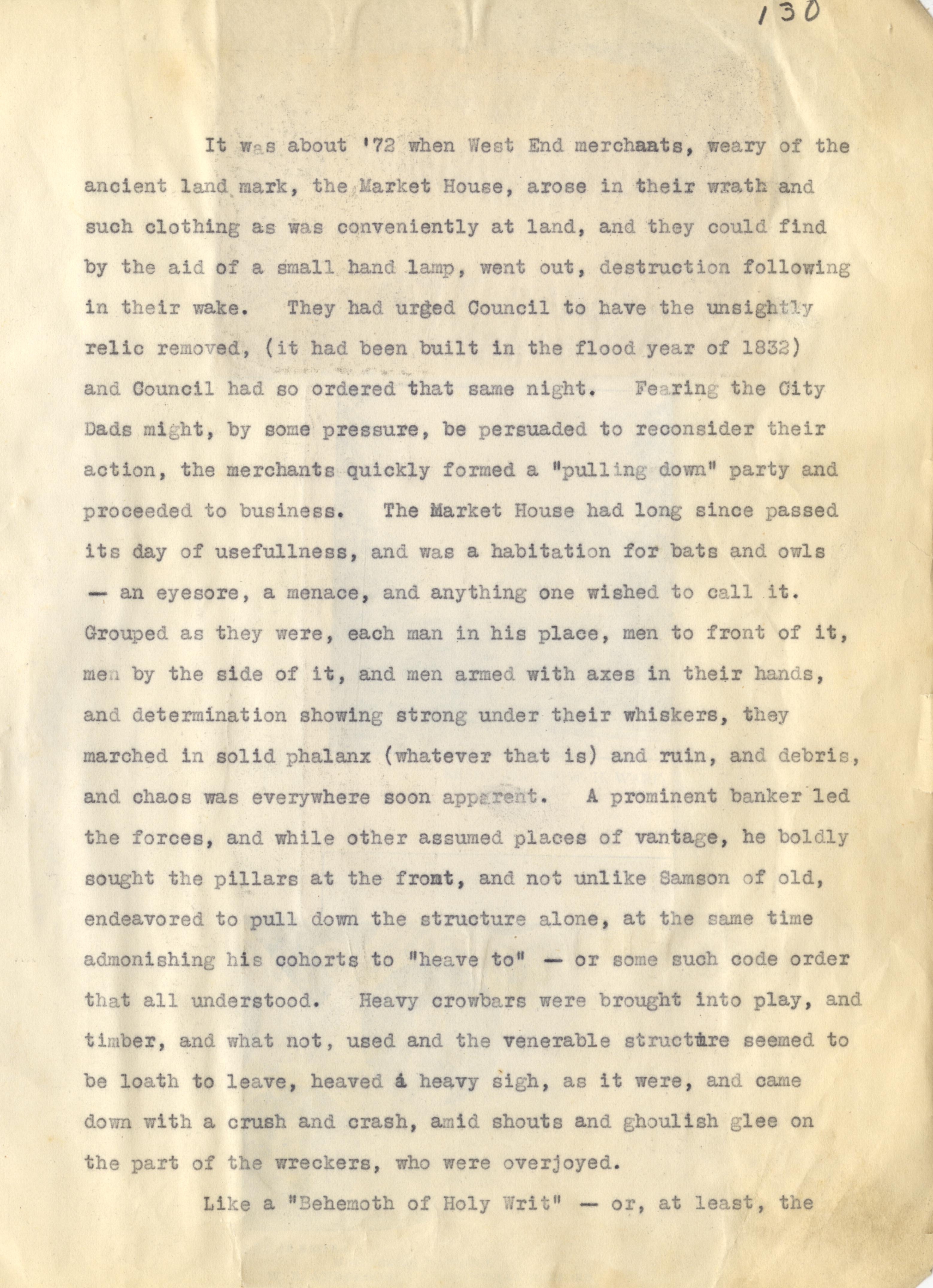 - Scanned page 130 from Henry A. Lorberg scrapbook containing a typed text account of The Market House's demolition.